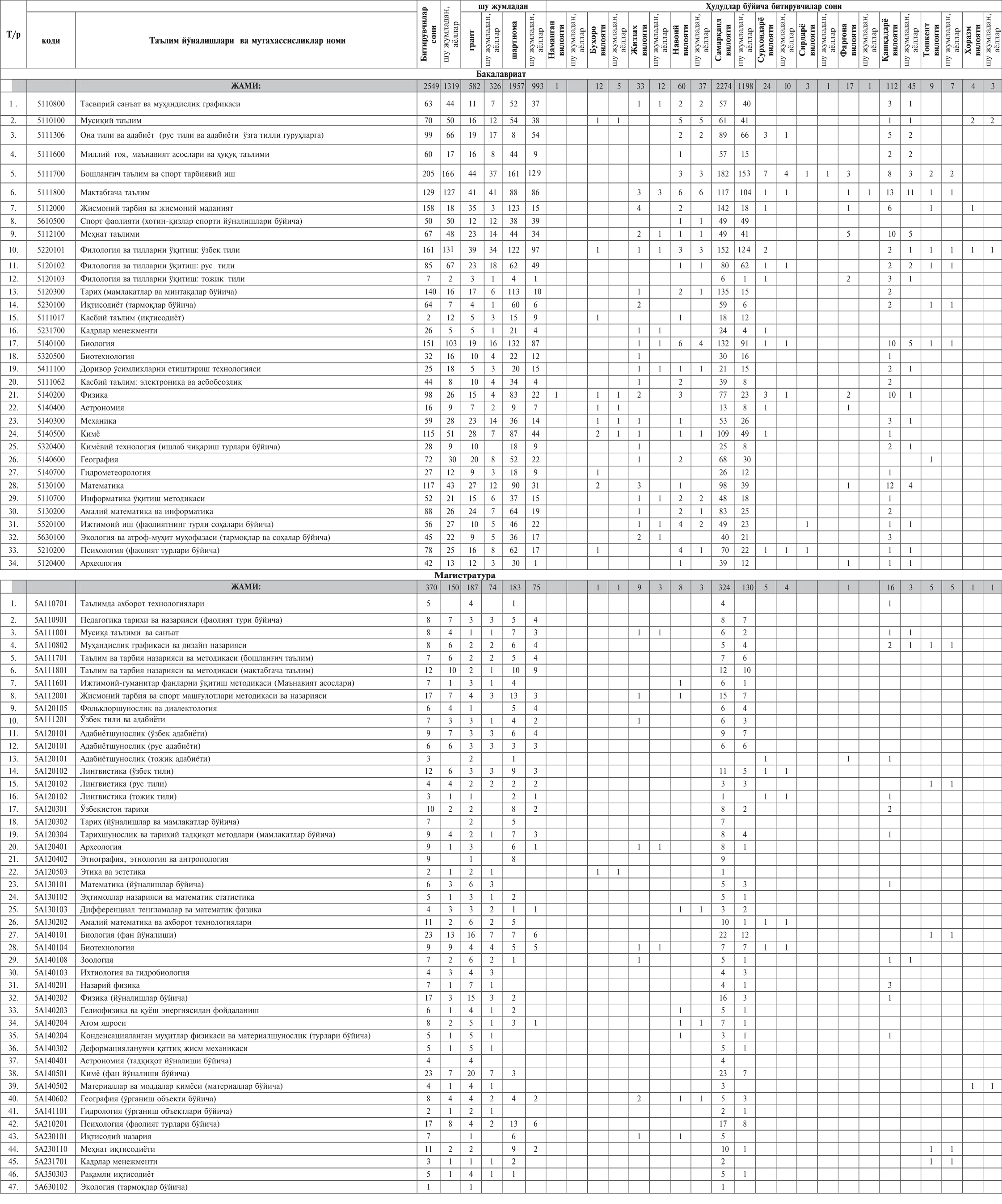 Ushbu o‘quv yilida universitetda 34 ta ta’lim yo‘nalishida bakalavrlar va 47 ta yo‘nalishda magistratura mutaxasislari tayyorlanmoqda. O‘z sohasida yetarli bilim va ko‘nikmalarga ega bo‘lganb hozirgi zamon talablariga javob bera oladigan hamda raqobatlashadigan yosh mutaxasislarga ehtiyoj bo‘lgan barcha korxona, tashkilot va ta’lim muassasalari SamDU rektori nomiga talabnoma xatlari bilan murojaat qilishlari mumkin.