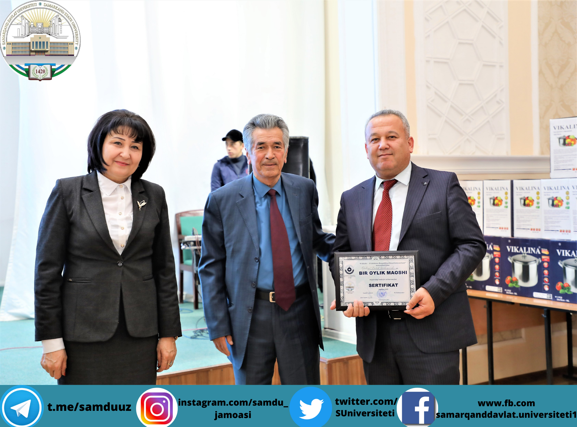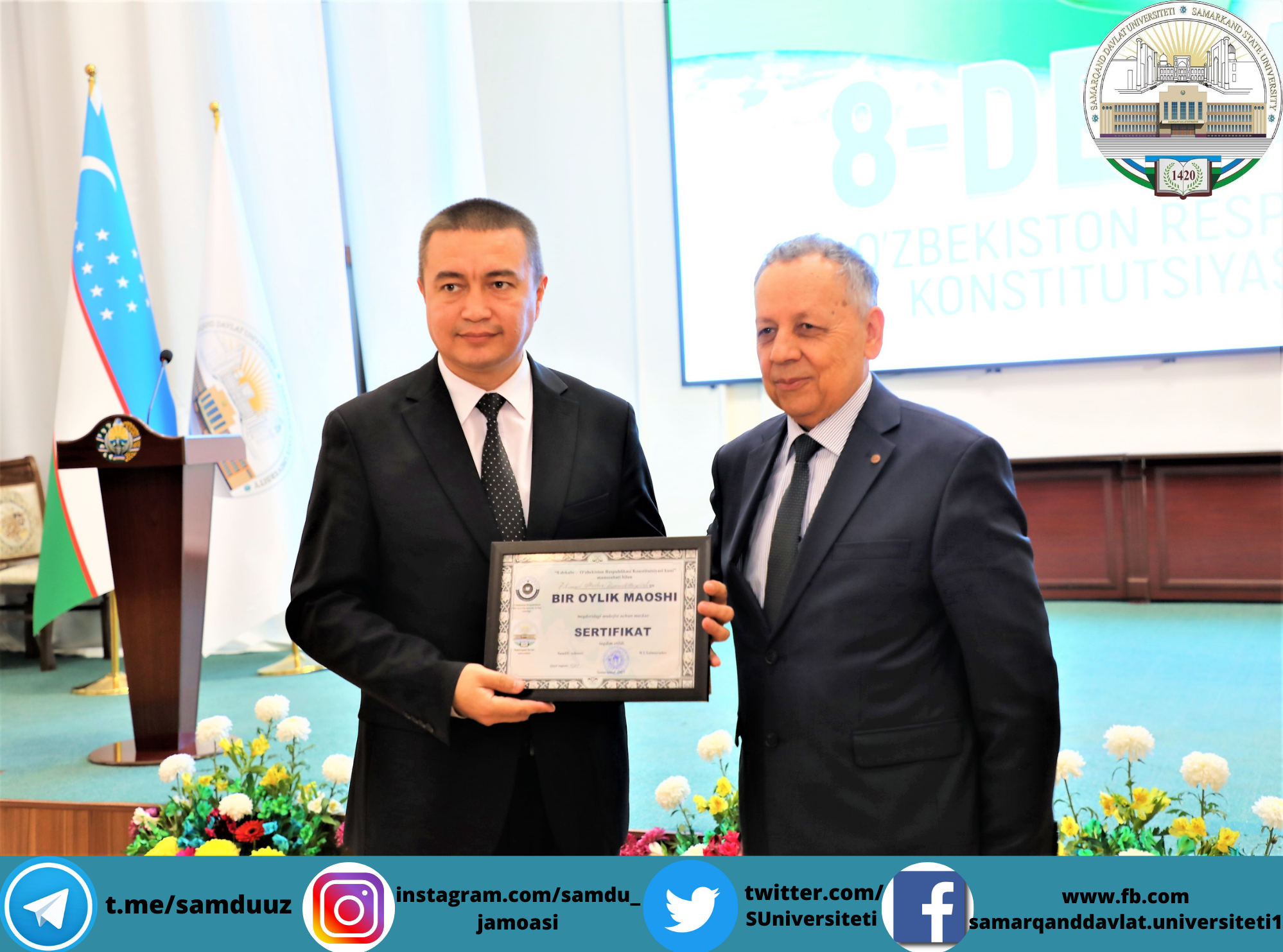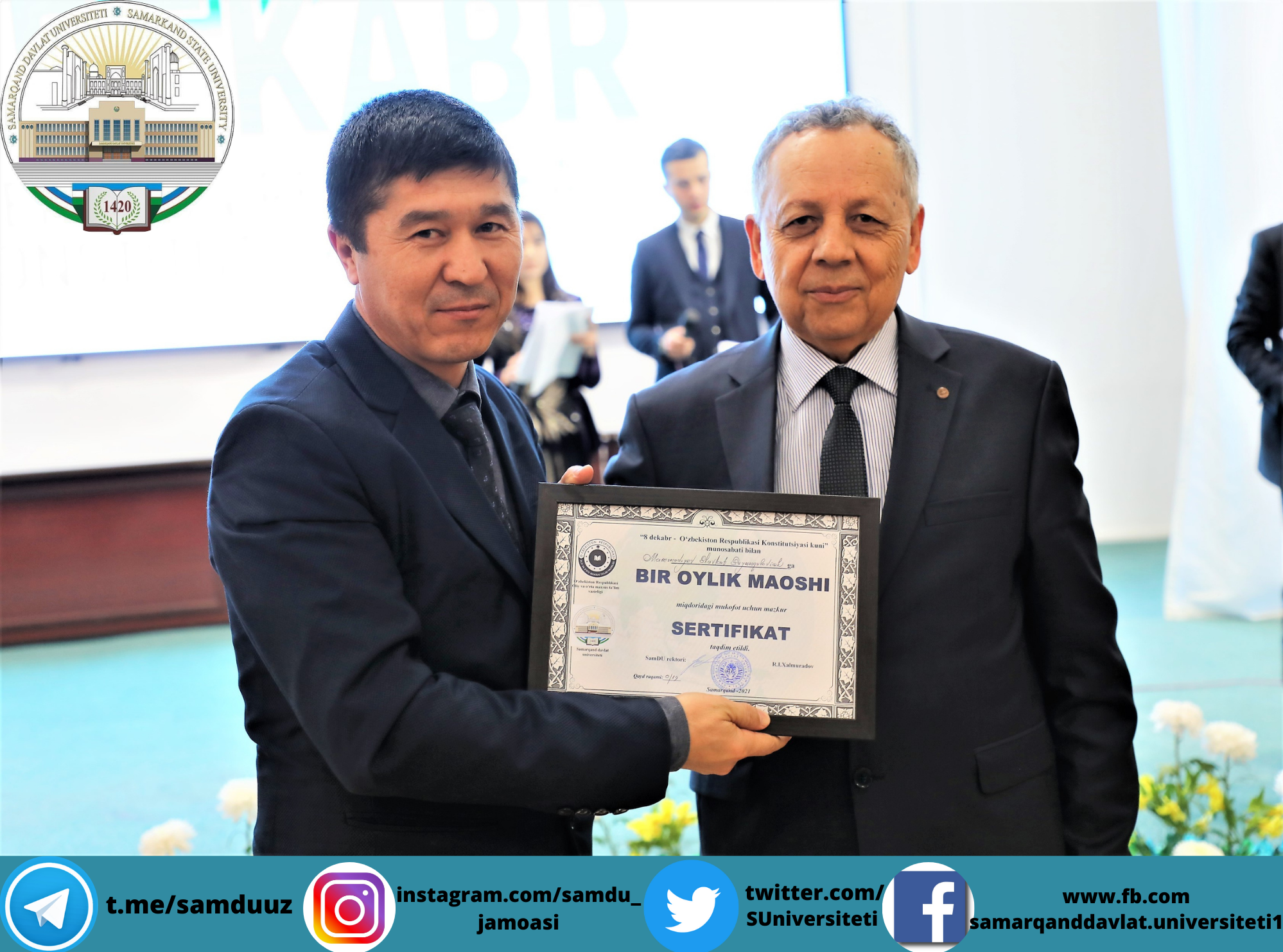 Самарқанд давлат университетида Конституциямизнинг 29 йиллиги муносабати билан байрам шодиёналари бўлиб ўтди. Ушбу тарихий кун муносабати билан йил давомида фидокорона меҳнат фаолияти олиб борган 300 га яқин профессор-ўқитувчилар, 40 нафар фаол ва иқтидорли талабалар университет ректори, Олий Мажлис Сенати аъзоси, профессор Рустам Холмуродовнинг тегишли буйруғига асосан пул мукофотлари ва эсдалик совғалари билан тақдирланди.