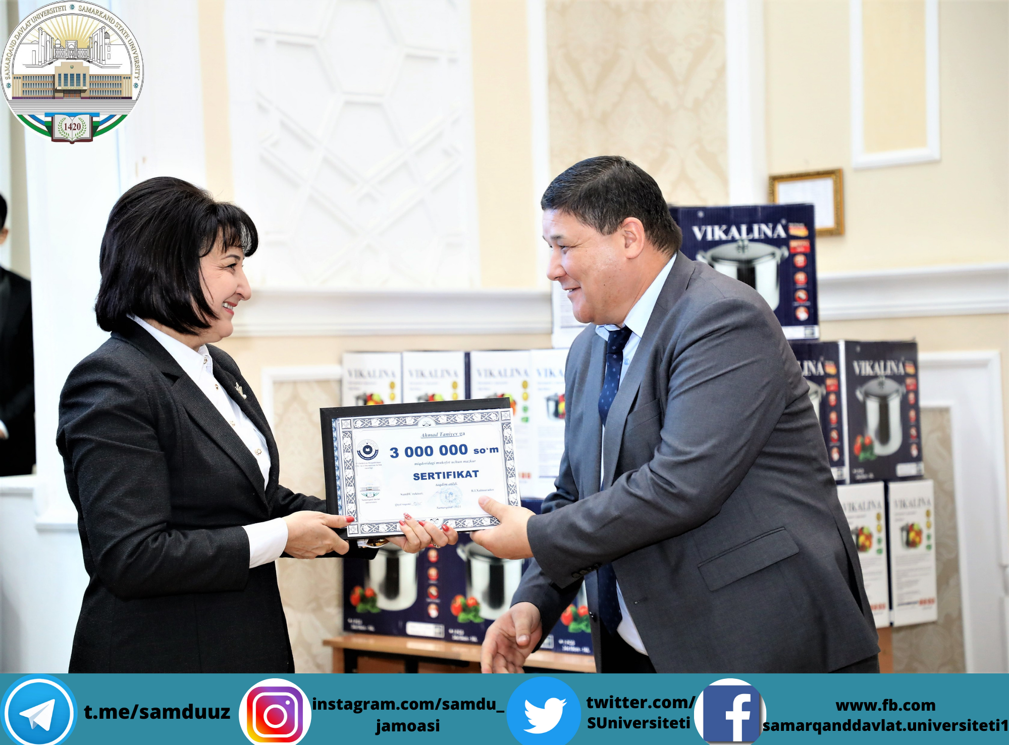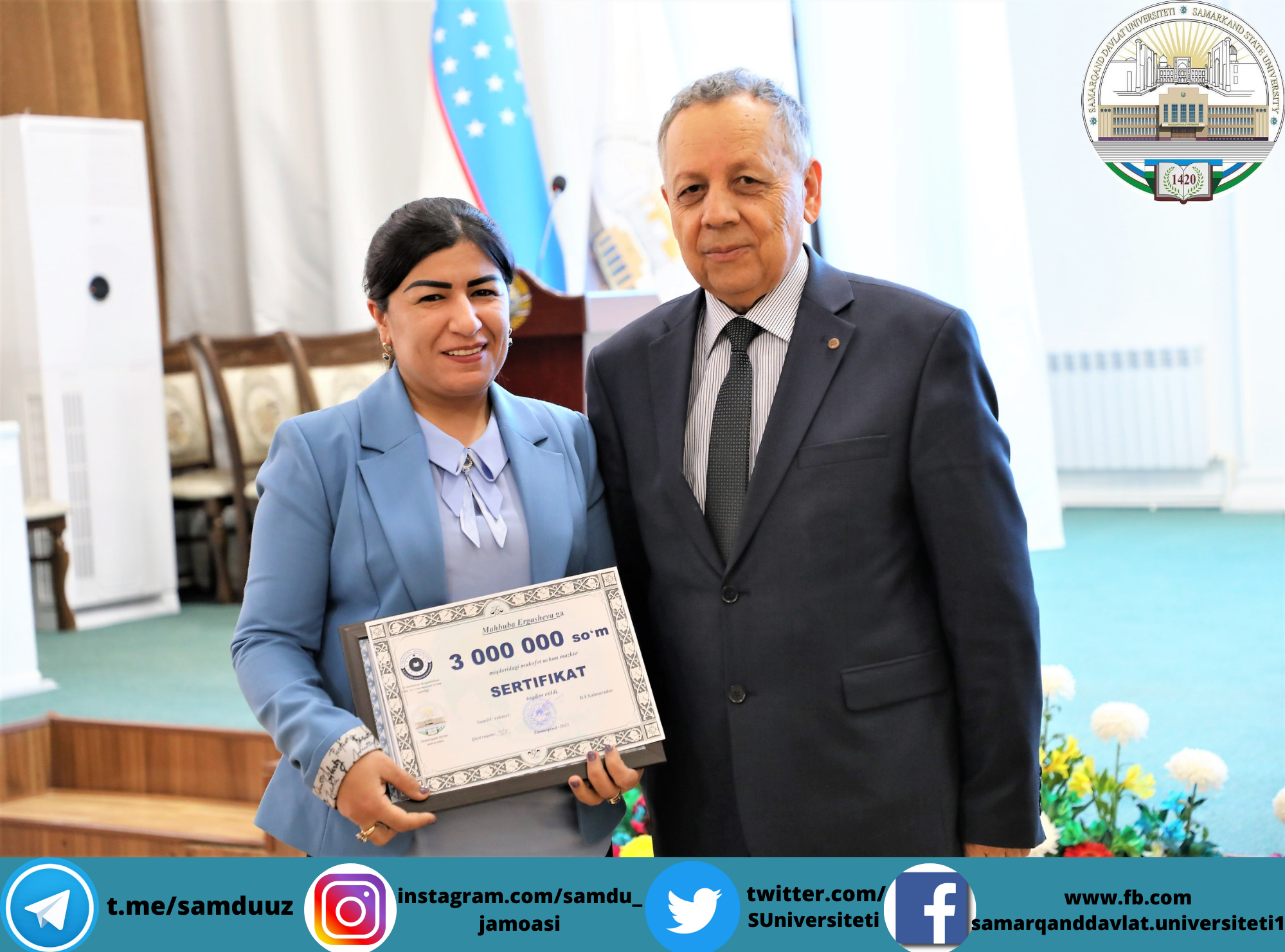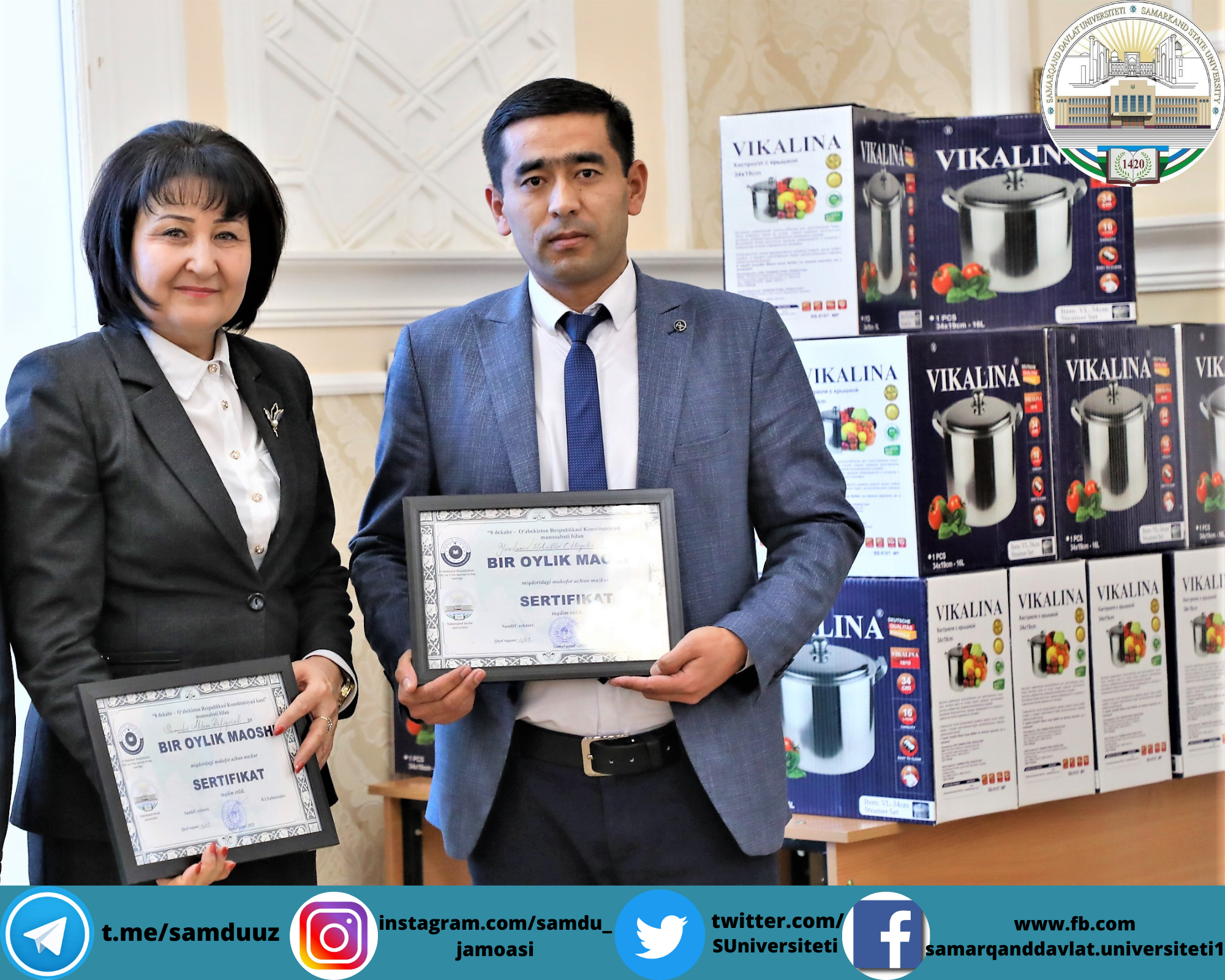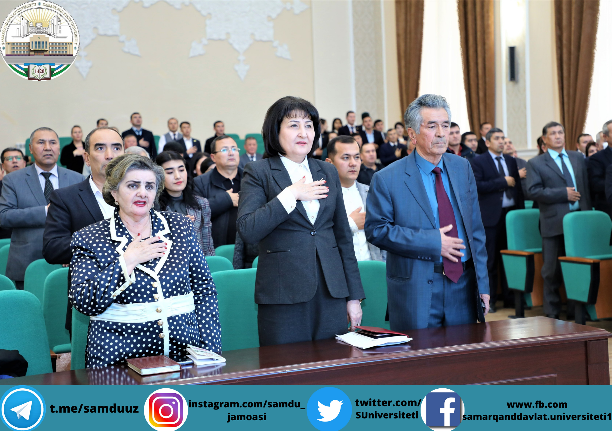 Самарқанд давлат университетида Конституциямизнинг 29 йиллиги муносабати билан байрам шодиёналари бўлиб ўтди. Ушбу тарихий кун муносабати билан йил давомида фидокорона меҳнат фаолияти олиб борган 300 га яқин профессор-ўқитувчилар, 40 нафар фаол ва иқтидорли талабалар университет ректори, Олий Мажлис Сенати аъзоси, профессор Рустам Холмуродовнинг тегишли буйруғига асосан пул мукофотлари ва эсдалик совғалари билан тақдирланди.