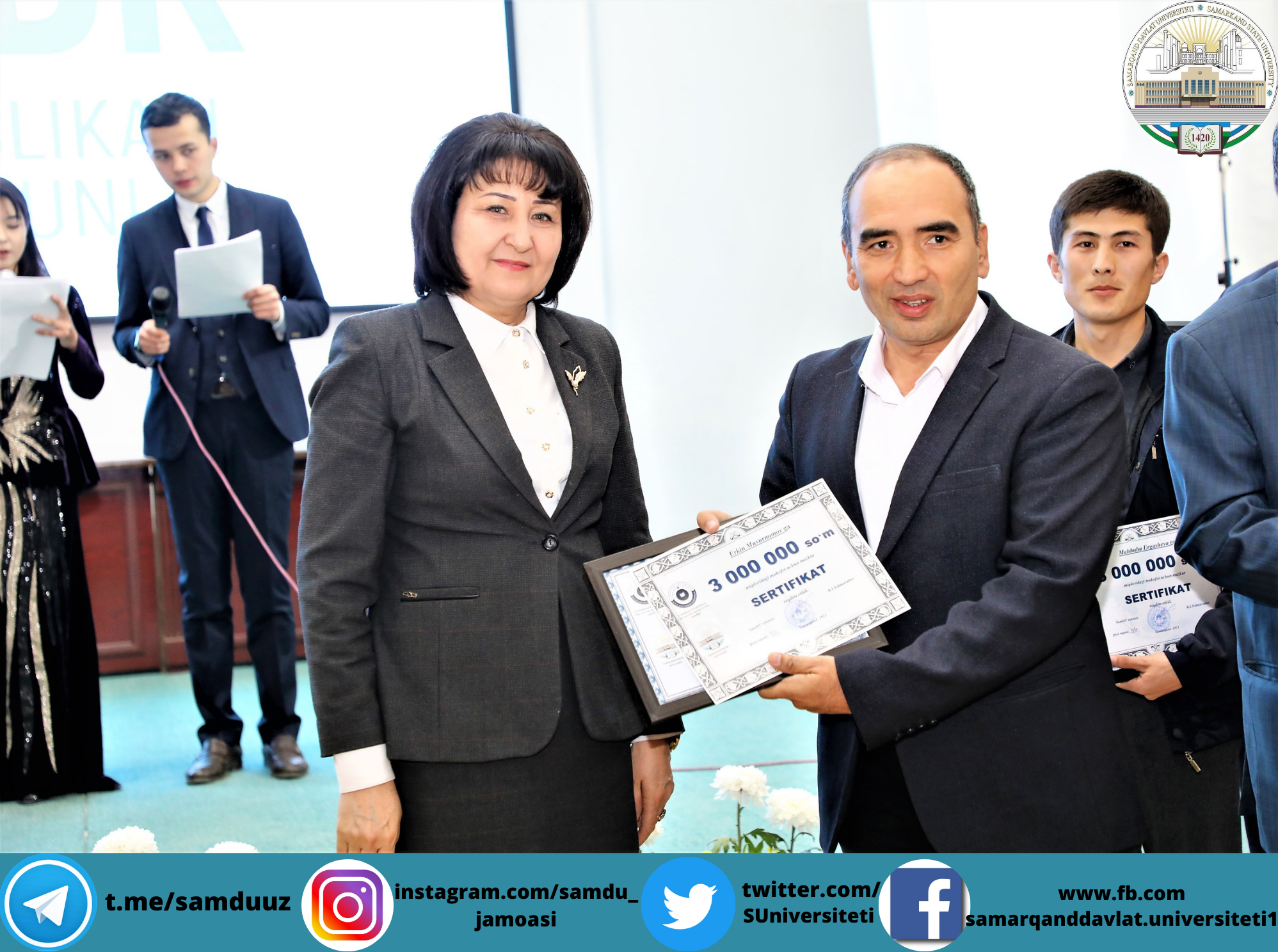 Пул мукофотларининг сертификатлари ва эсдалик совғаларини университет ректори номидан ўқув ишлари бўйича проректор Аҳмаджон Солиев, ёшлар масалалари ва маънавий-маърифий ишлар бўйича проректор Зебинисо Раҳмонова ҳамда университет бошланғич касаба уюшмаси қўмитаси раиси Шавкат Маҳматмуродовлар топширди.