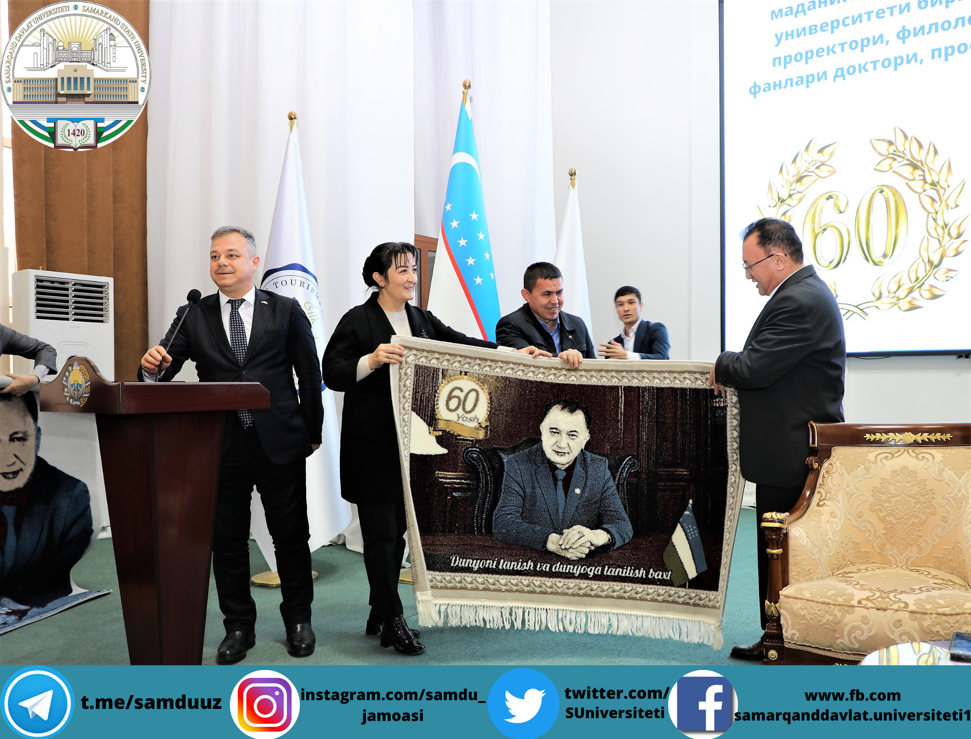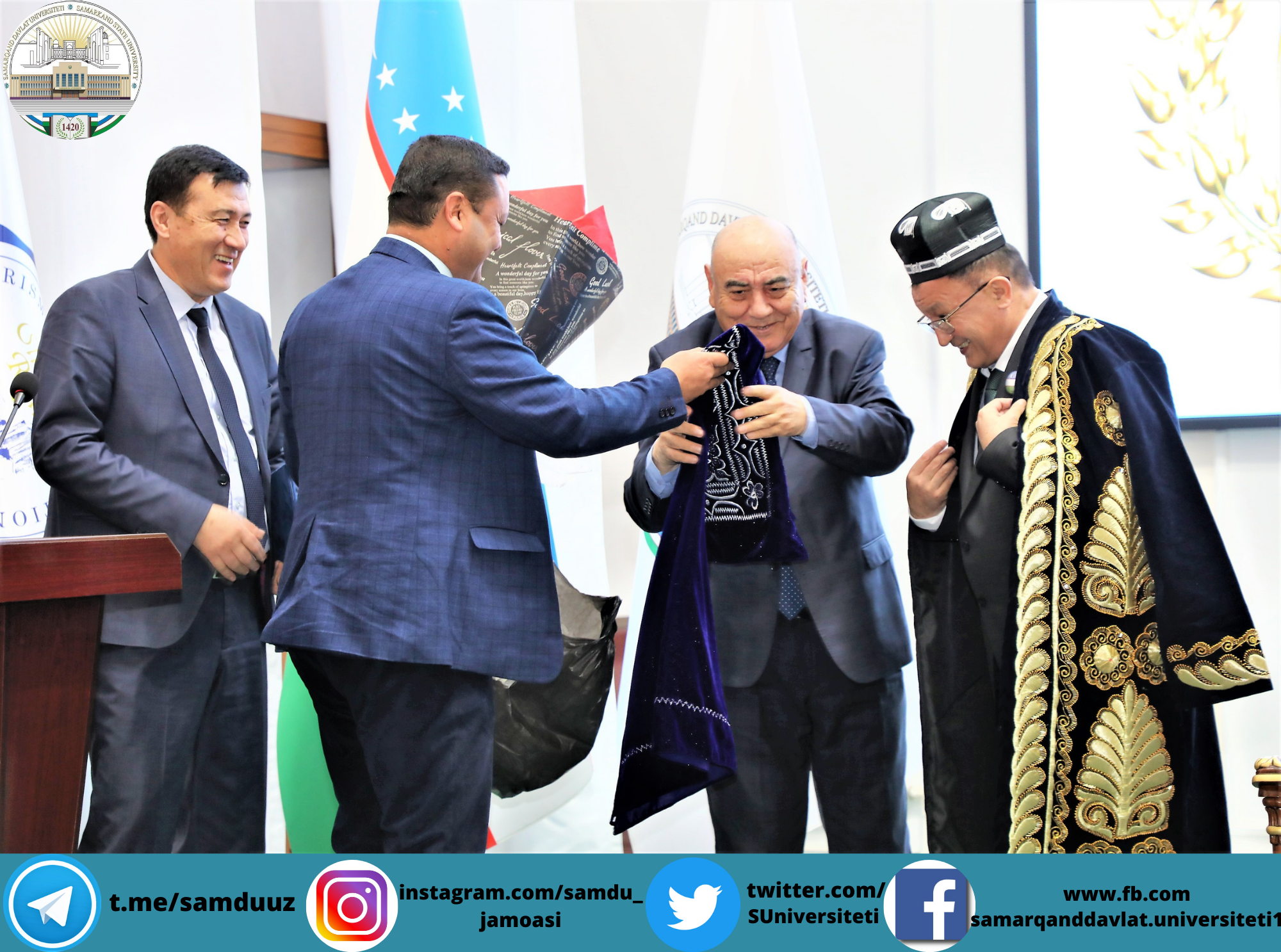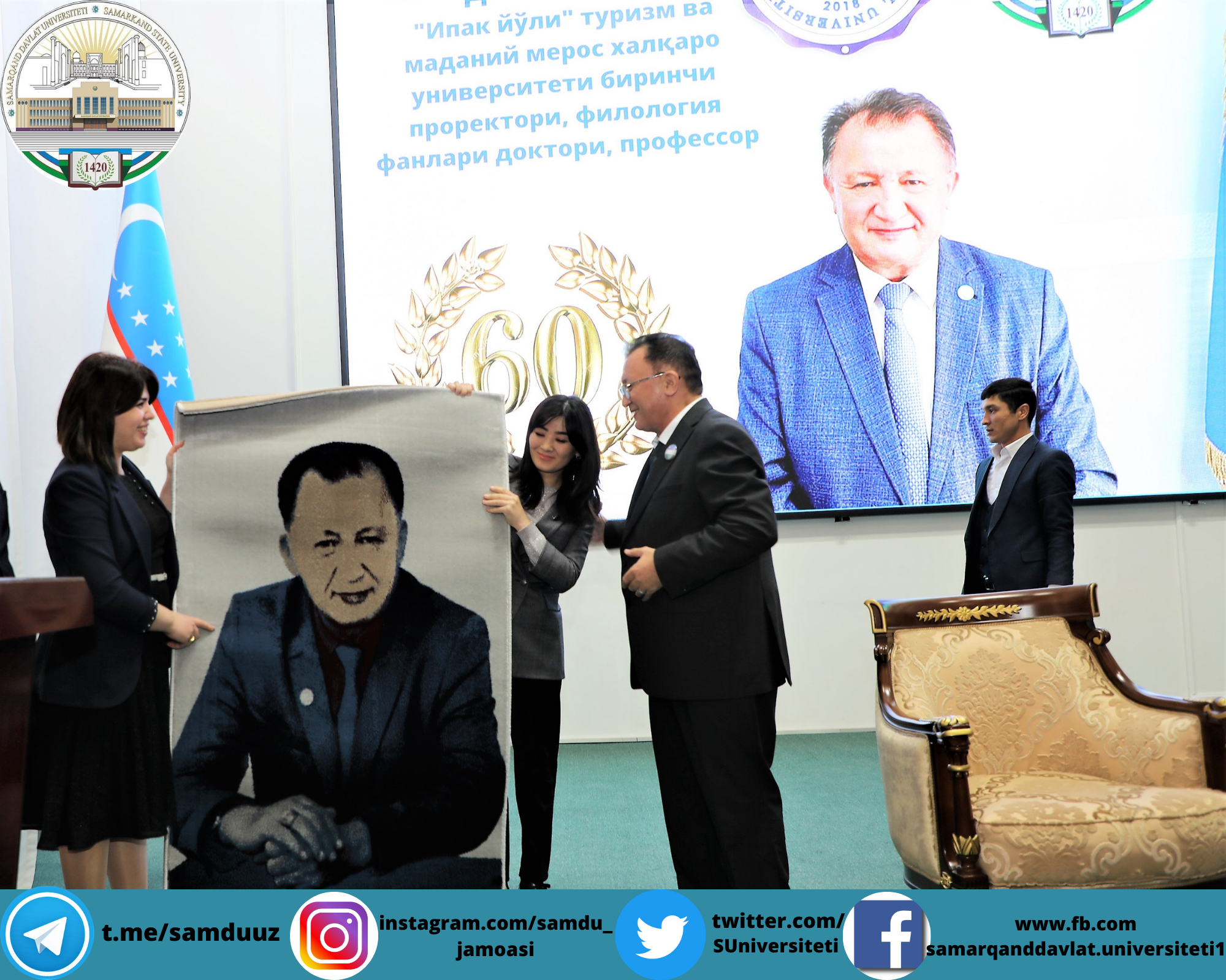 Тадбирни Самарқанд давлат университети ўқув ишлари бўйича проректори, профессор Аҳмаджон Солиев очиб, университет ректори, Олий Мажлис Сенати аъзоси, профессор Рустам Холмуродовнинг табригини ўқиб эшиттирди ва эсдалик совғалари топширди.