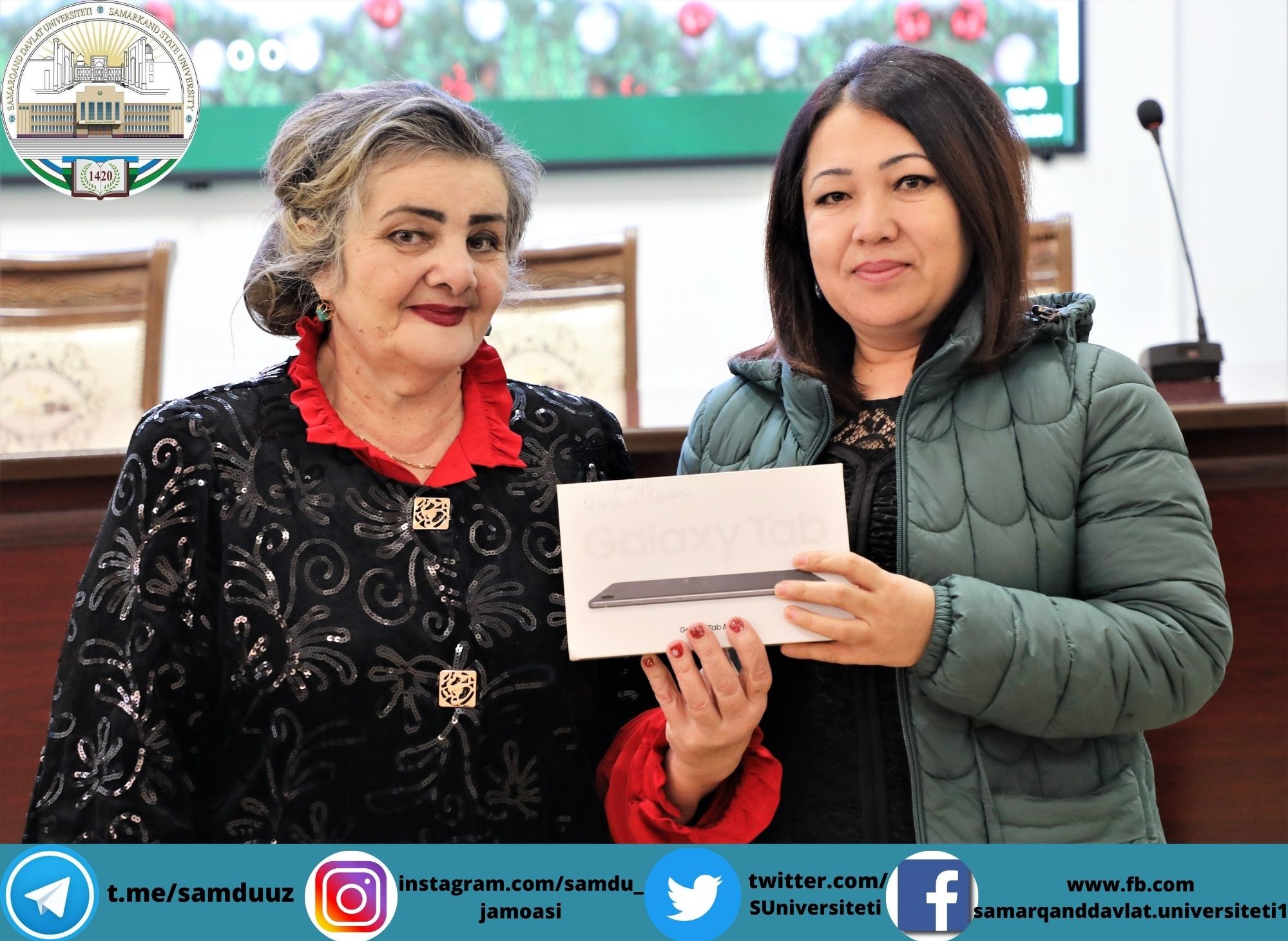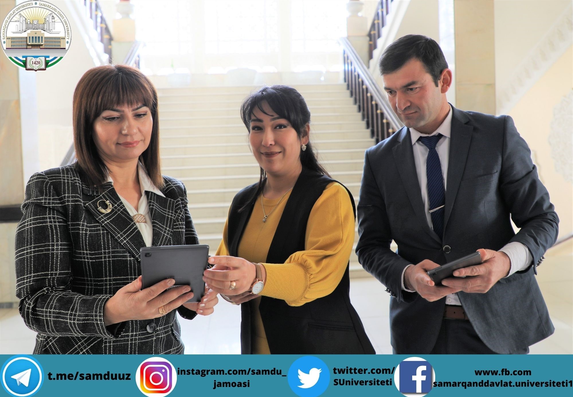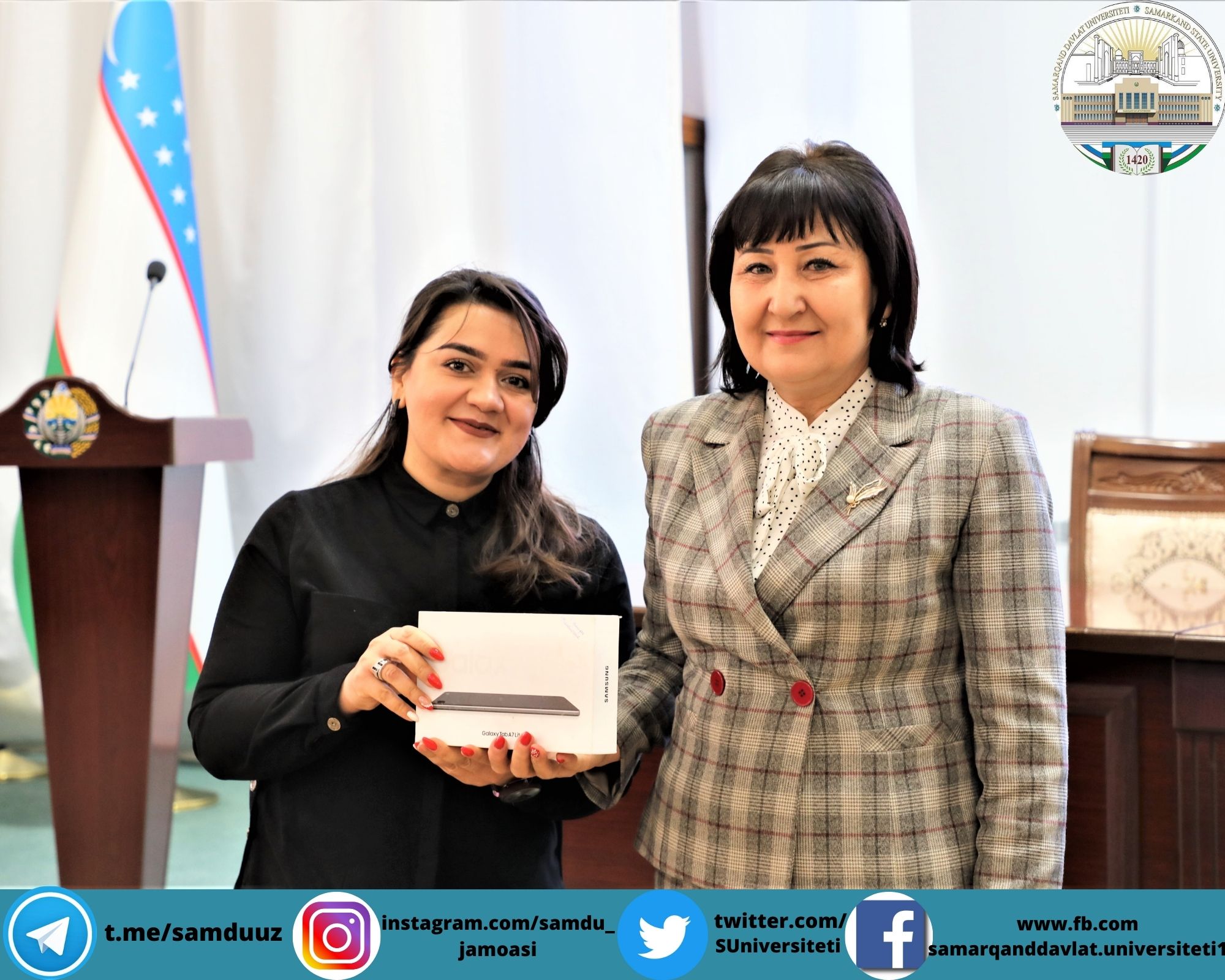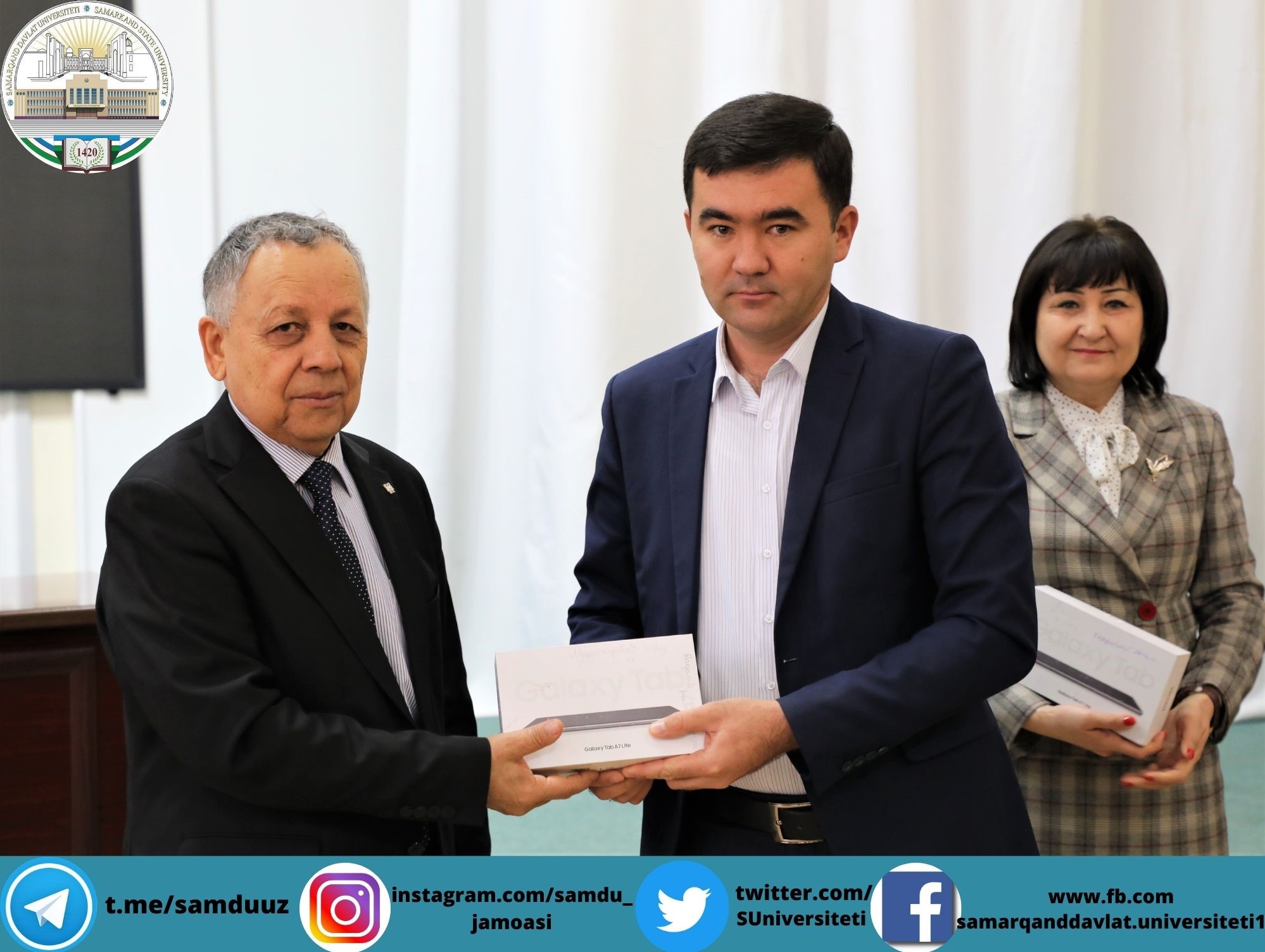 Планшетларни СамДУ ўқув ишлари бўйича проректори Аҳмаджон Солиев, ёшлар масалалари ва маънавий-маърифий ишлар бўйича проректор Зебинисо Раҳмонова, хотин-қизлар масалалари бўйича маслаҳат кенгаши раиси Шарофат Бектошевналар топширди.