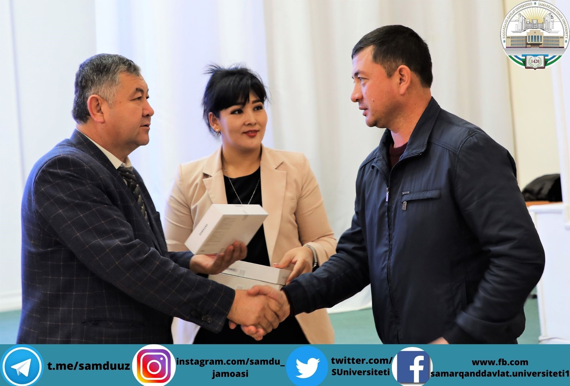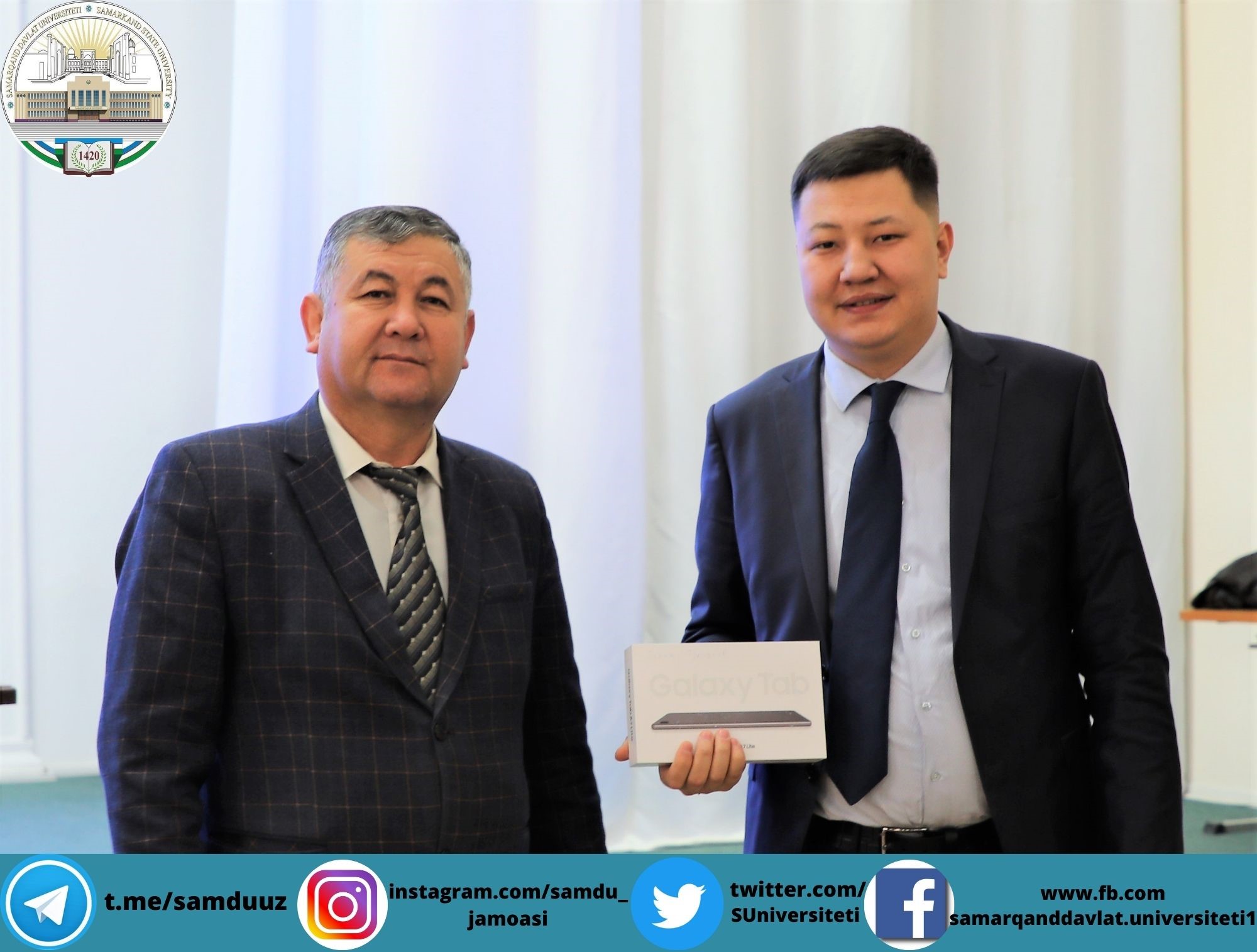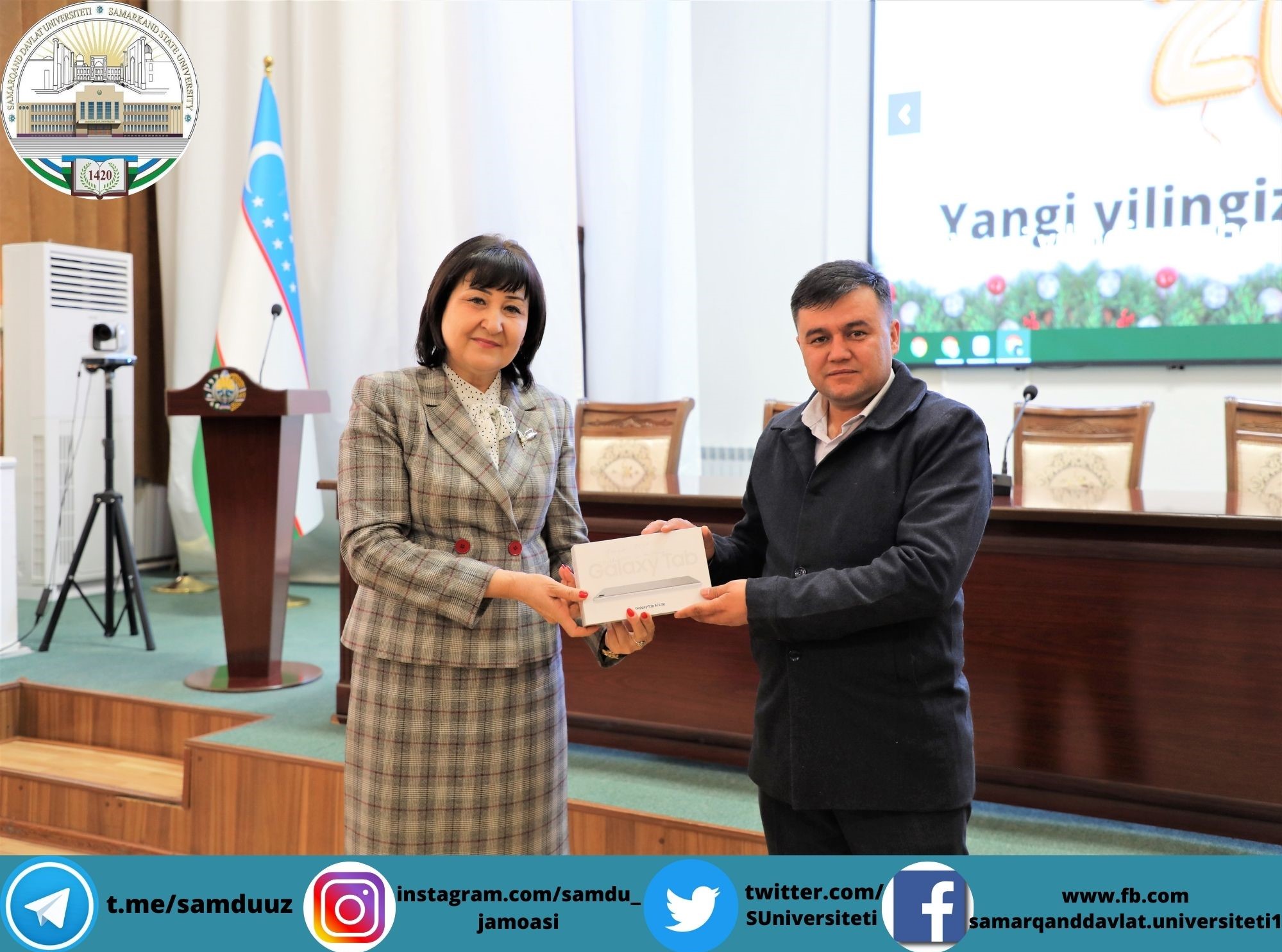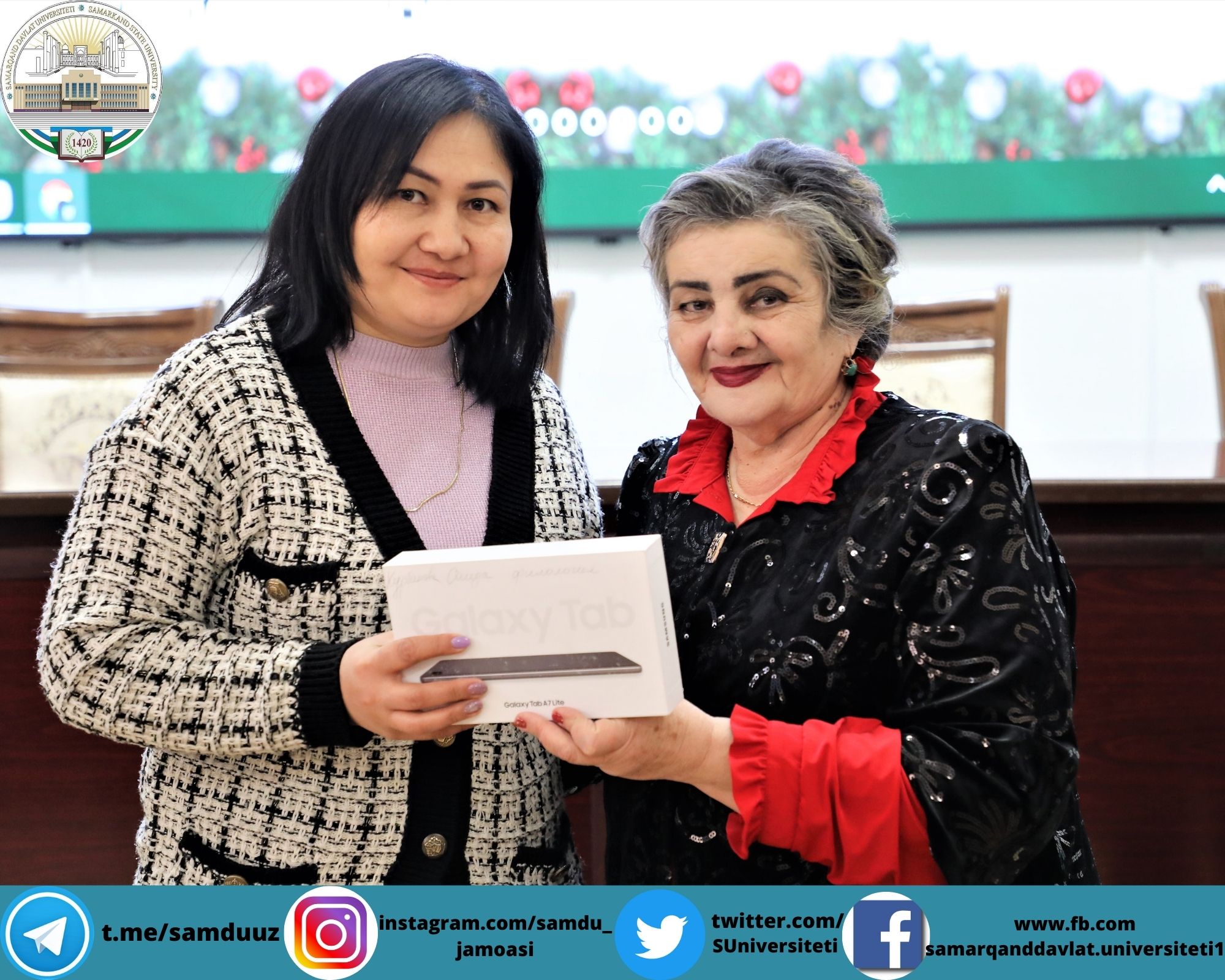 Планшетларни СамДУ ўқув ишлари бўйича проректори Аҳмаджон Солиев, ёшлар масалалари ва маънавий-маърифий ишлар бўйича проректор Зебинисо Раҳмонова, хотин-қизлар масалалари бўйича маслаҳат кенгаши раиси Шарофат Бектошевналар топширди.