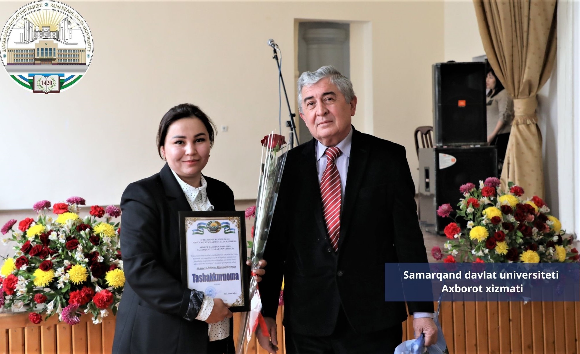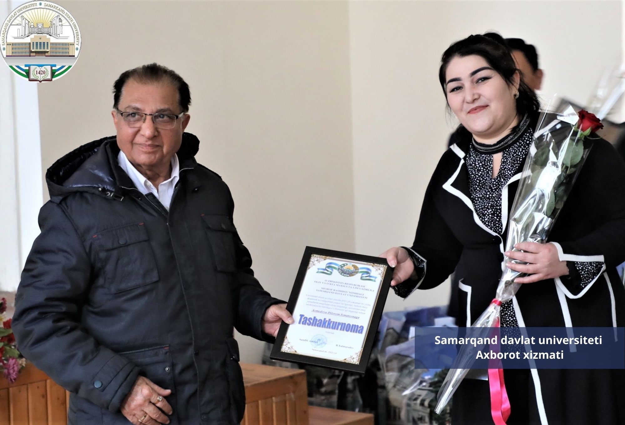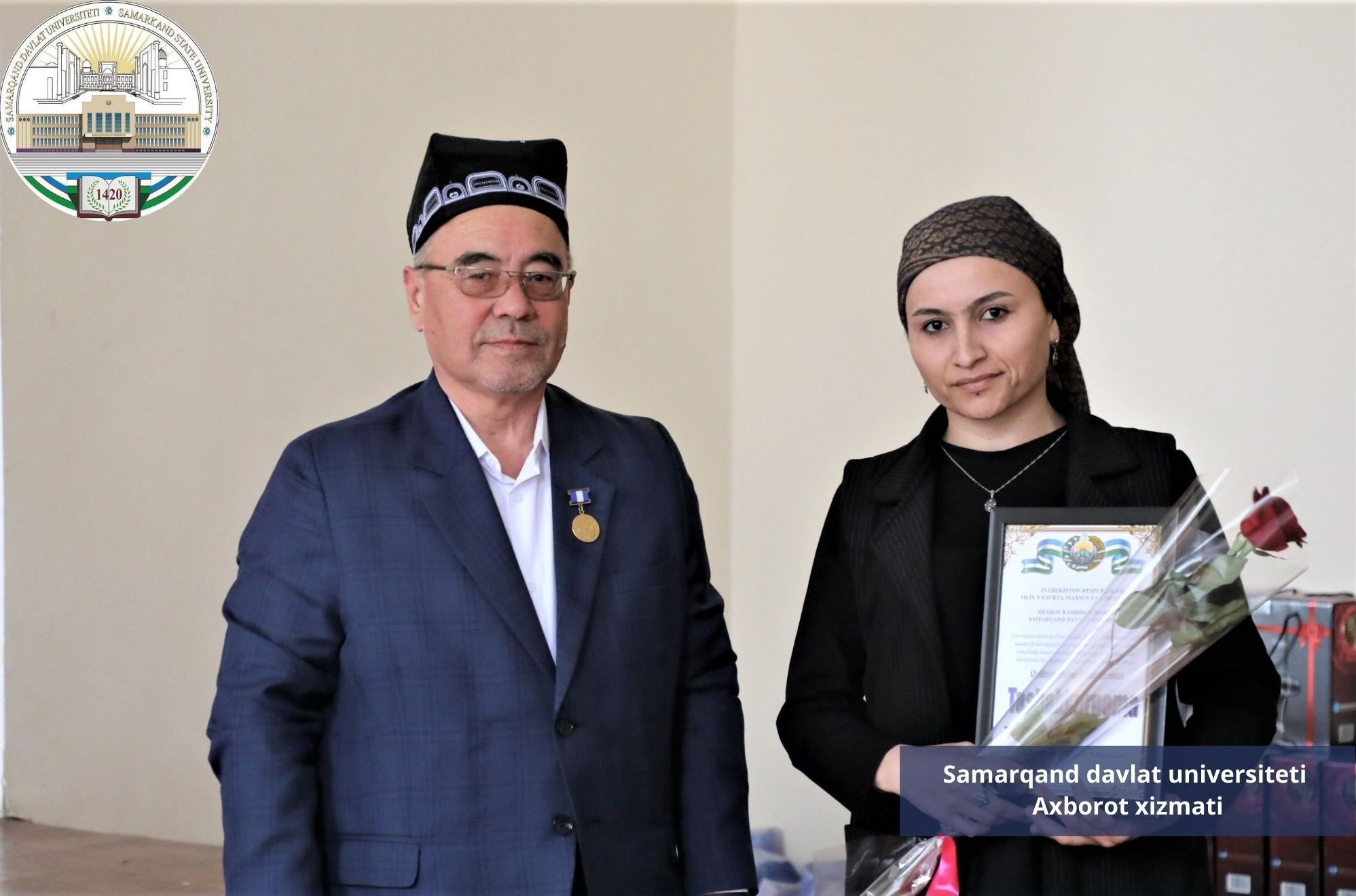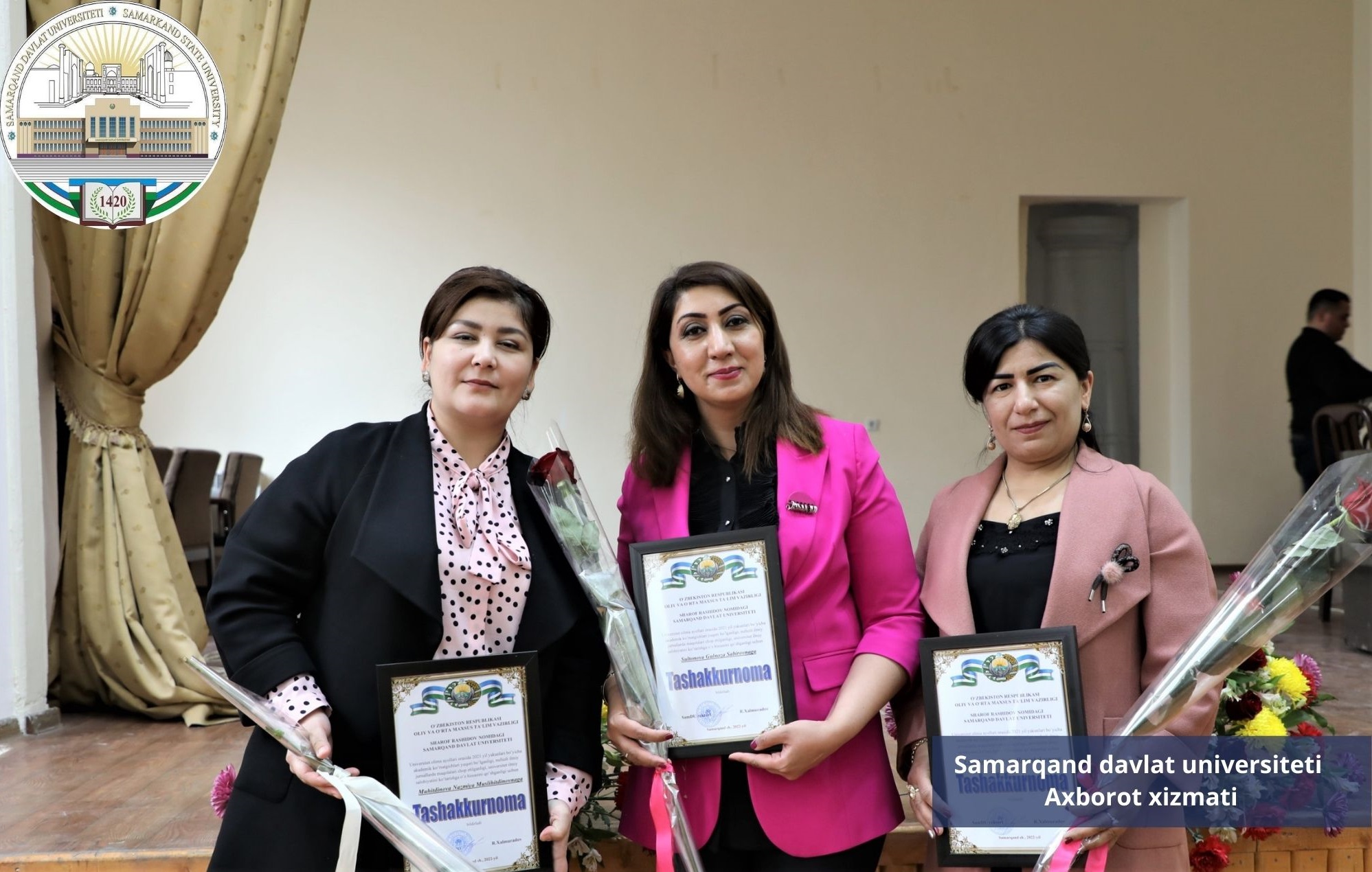 Шунингдек, 377 нафар аёл профессор-ўқитувчи ва ишчи-ходимларга бир миллион сўм пул мукофотлари билан, 2021 йил якуни бўйича «Ссопус», “Веб оф Ссиенсе” каби халқаро илмий-техник базалардаги илмий журналларда мақолалар чоп этилганлиги, университетнинг рейтинг кўрсаткичларини оширишга ўз ҳиссасини қўшганлиги учун 8 нафар профессор-ўқитувчи хотин-қизлар СамДУ ректорининг ташаккурномаси ҳамда қимматбаҳо совғалари билан тақдирланди. Худди шундай ташаккурномалар ва қимматбаҳо совғалар 2021 йилда диссертация ишларини муваффақиятли ҳимоя қилиб, илмий даража олган, яна 14 нафар профессор-ўқитувчи хотин-қизларга топширилди.
