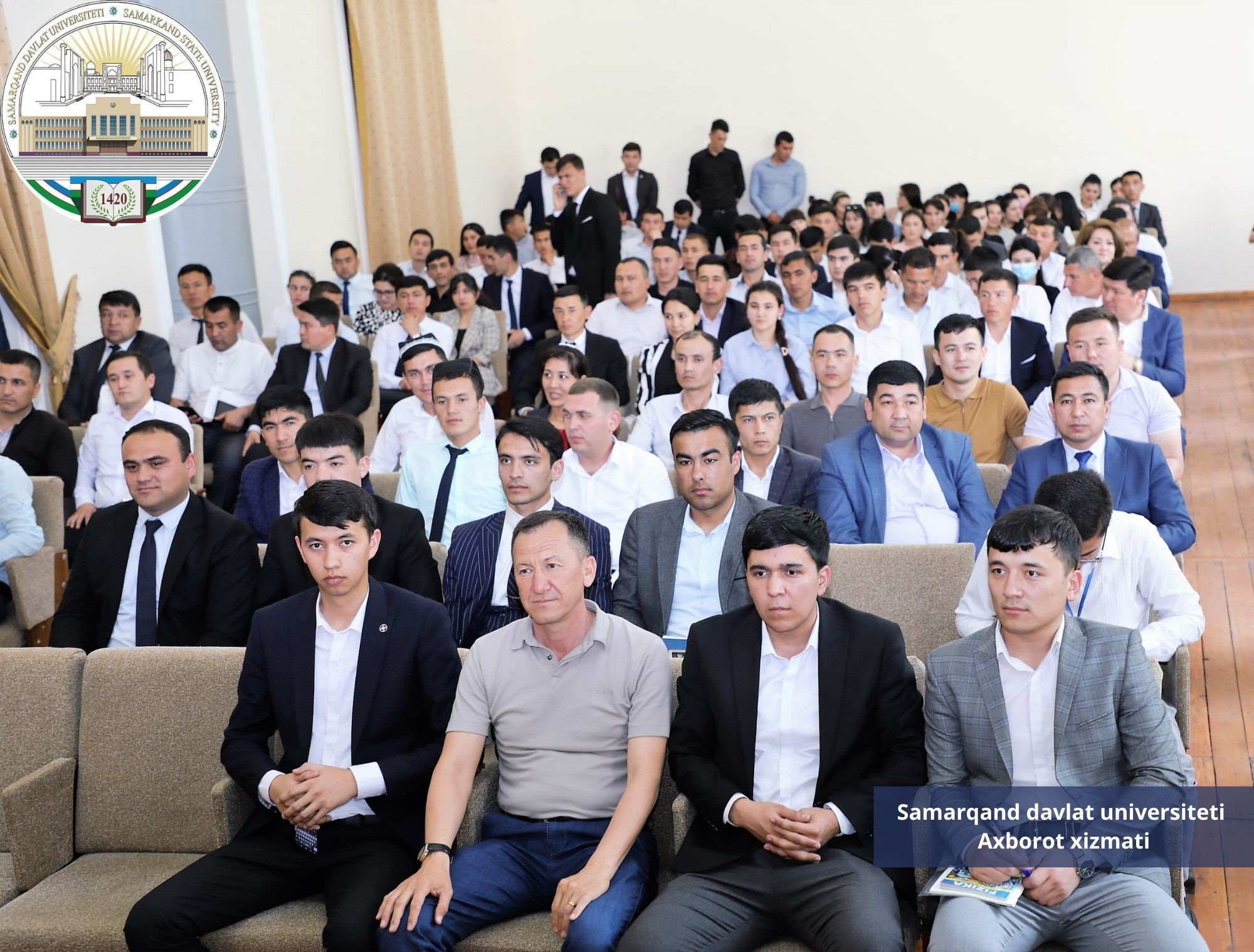 Тадбирда Самарқанд вилоят ҳокимлиги ташкилий кадрлар гуруҳи раҳбари Беҳзод Раҳматуллаев, магистрантлар ва битирувчи талабалар иштирок этмоқда.