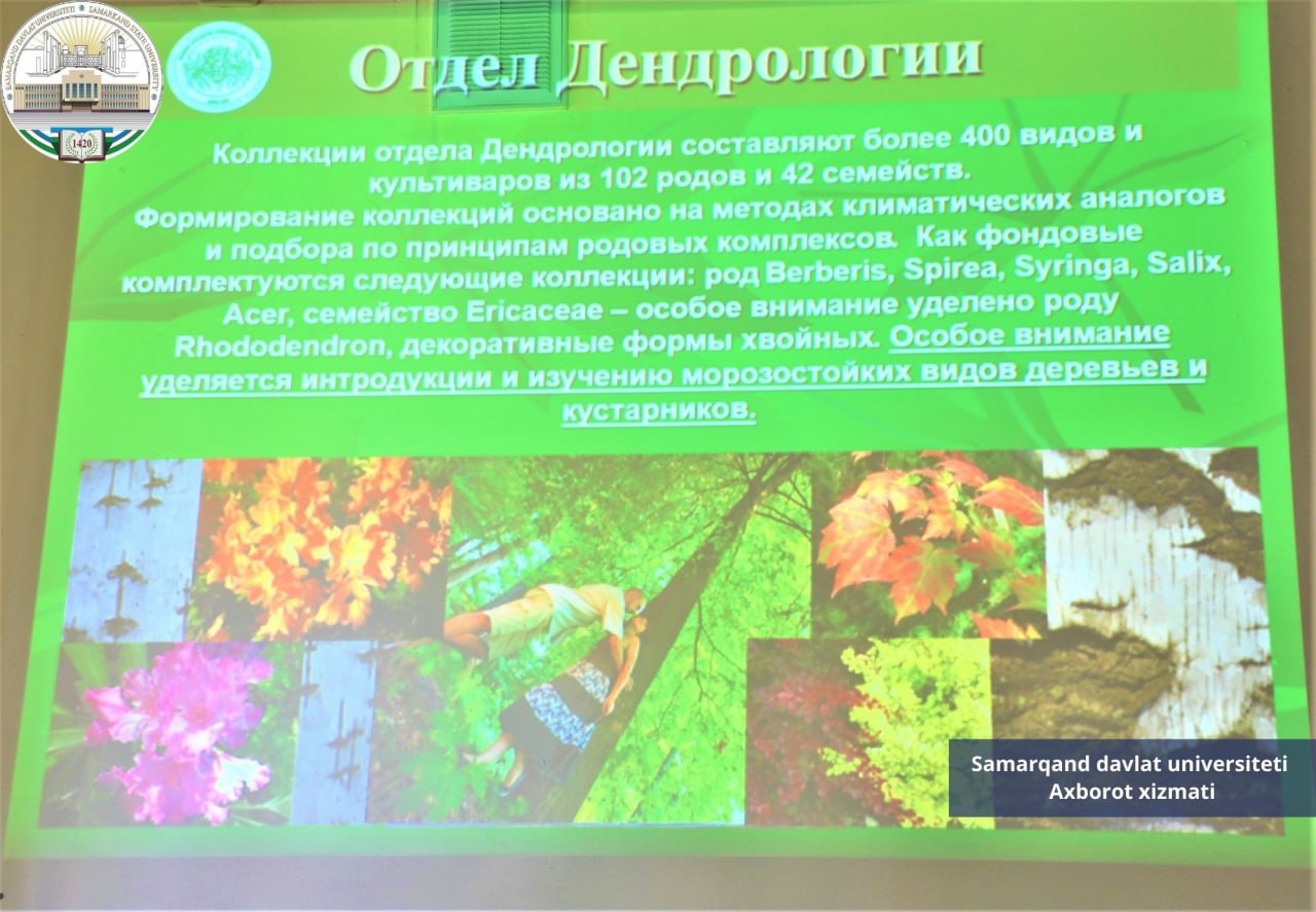 - Самарқанд давлат университети ботаника боғи ўтган асрнинг етмишинчи йилларида ташкил топган, майдони 36 гектар. Боғда 5000 дан зиёд мевали ва манзарали дарахтлар, бутасимон, гул ўсимликлари мавжуд, - дейди СамДУ ботаника кафедраси мудири, профессор Хислат Ҳайдаров. - Улардан табиий ва аниқ фанлар йўналишига доир илмий ишларда фойдаланиб келинмоқда. Ушбу боғда Ўзбекистон флорасига мансуб, ўсимликлар ва бошқа давлат интрадукциясилари ташкил этилган. Қолаверса, антиқа доривор ўсимликлар ва Қизил Китобга киритилган ўсимликлар ўстирилади. Фаолиятимизни янада янгилаш ва ривожлантириш мақсадида хорижий Ботаника боғлари тажрибаларини ўрганиб чиқяпмиз. Шу мақсадда Твер давлат университетидан мутахассисларни жалб қилганмиз. Ҳозирда бу олимлар билан ҳамкорликда СамДУ Ботаника боғини қайта тиклаш лойиҳасини ишлаб чиқяпмиз. Бу ер нафақат боғ, балки илмий лабораторияларни ҳам ташкил қилиш режамизга киритилган.