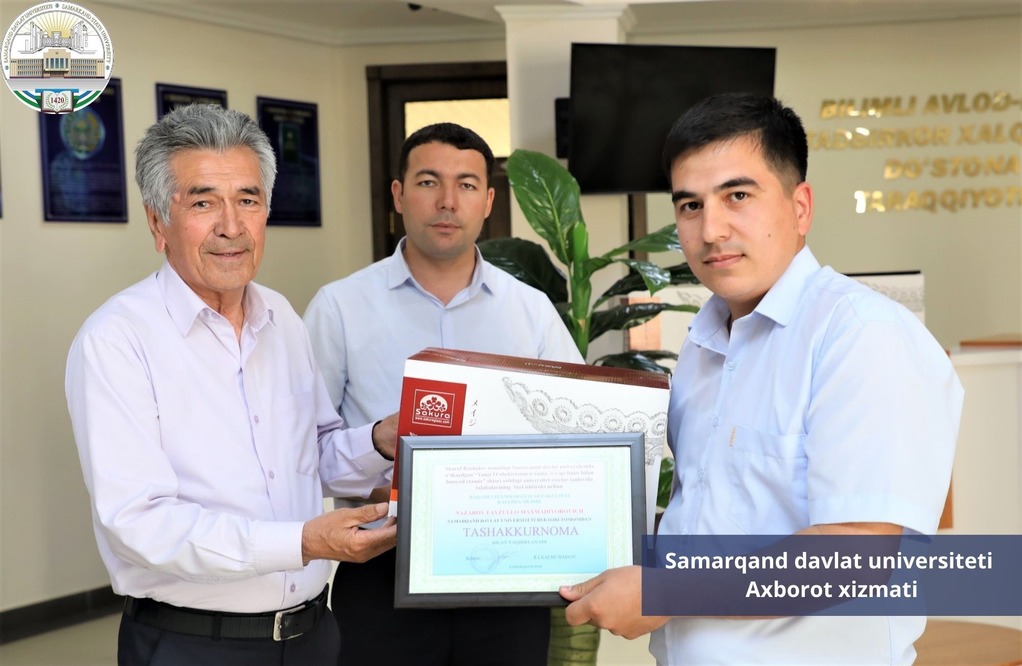 Самарқанд давлат университетида “Янги Ўзбекистонни ўзимиз ўз қўлларимиз билан бунёд этамиз” шиори остидаги эсселар танловининг университет босқичи ғолибларини тақдирлаш маросими бўлиб ўтди
