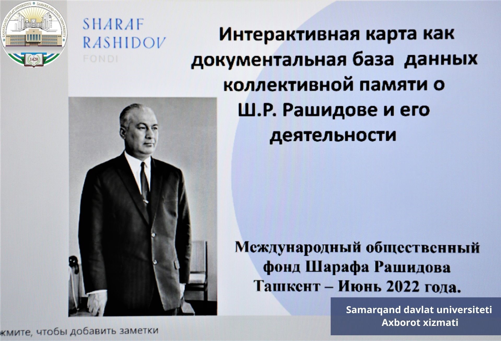 Республикамизни жуда оғир ва мураккаб йилларда бошқарган, эл-юртимиз шаъни, Ватанимиз нуфузи йўлида садоқат билан хизмат қилган атоқли давлат арбоби, таниқли ёзувчи Шароф Рашидов фаолиятини халқимиз тарихидан айри ҳолда тасаввур этиб бўлмайди. Айниқса, Шароф Рашидов таьлим олган ва номи берилган Самарқанд давлат университети майдонида Шароф Рашидов ёди абадий бўлиши шарт. Бу борада ёш авлодни унинг фаолияти ва асарларидан хабардор бўлиши муҳим масала ҳисобланади. Тадбир доирасида ушбу вазифани амалга оширишнинг ўзига хос кўриниши бўлган “Шароф Рашидов ва унинг фаолияти жамоавий хотирасининг визуал ҳужжатли базаси интерактив харитаси” лойиҳаси тақдимоти ўтказилди.