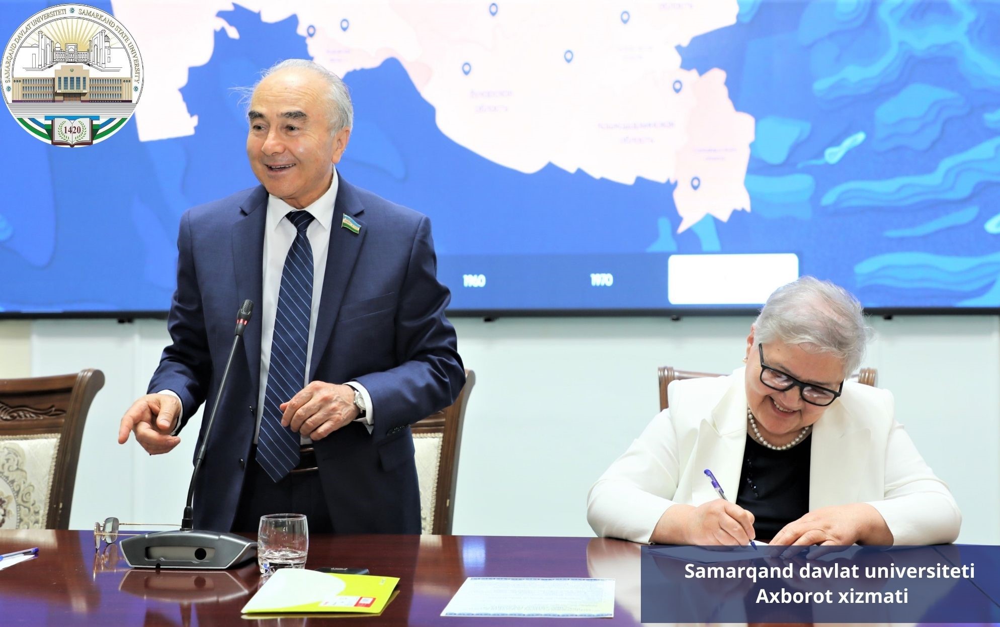 Тадбирнинг якуний қисмида Самарқанд давлат университетига Шароф Рашидов номидаги Халқаро жамоат фонди томонидан “Шароф Рашидовнинг давлат ва жамият фаолияти жамоавий хотирасининг Ўзбекистон Республикаси интерактив харитаси” аппарат-дастурий мажмуасини хайрия қилиш бўйича шартнома имзоланди.