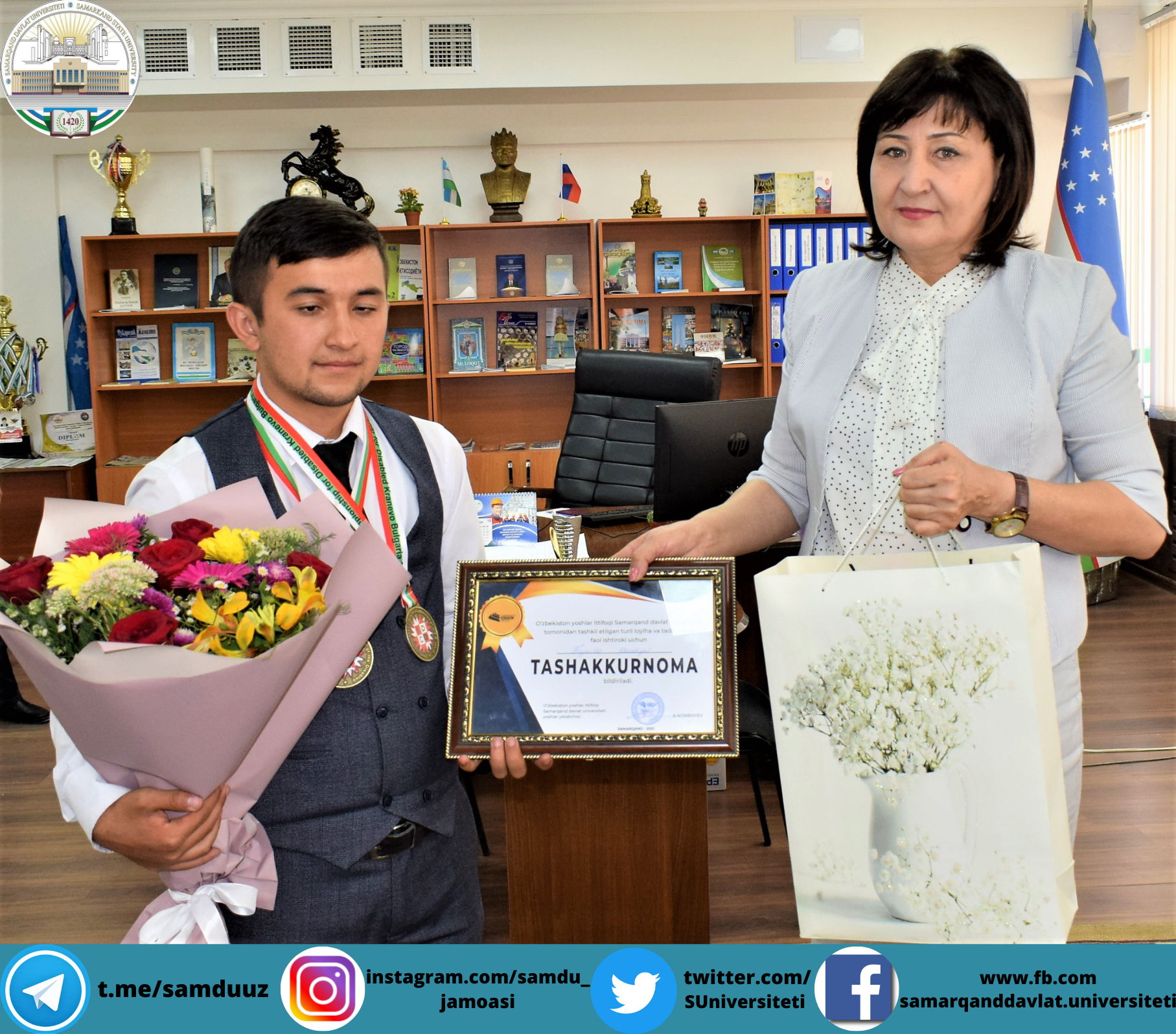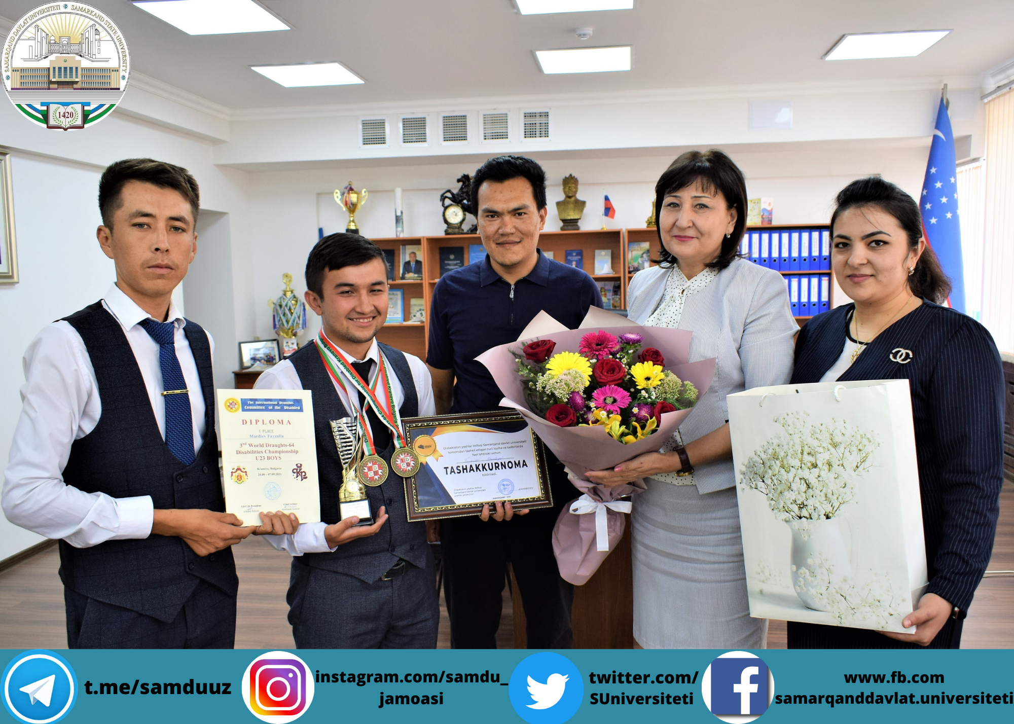 Universitetimiz yoshlar masalalari va ma’naviy-ma’rifiy ishlar bo‘yicha prorektori Zebiniso Rahmonova va Yoshlar ittifoqi tomonidan chempion munosib kutib olindi va esdalik sovg'alari topshirildi.