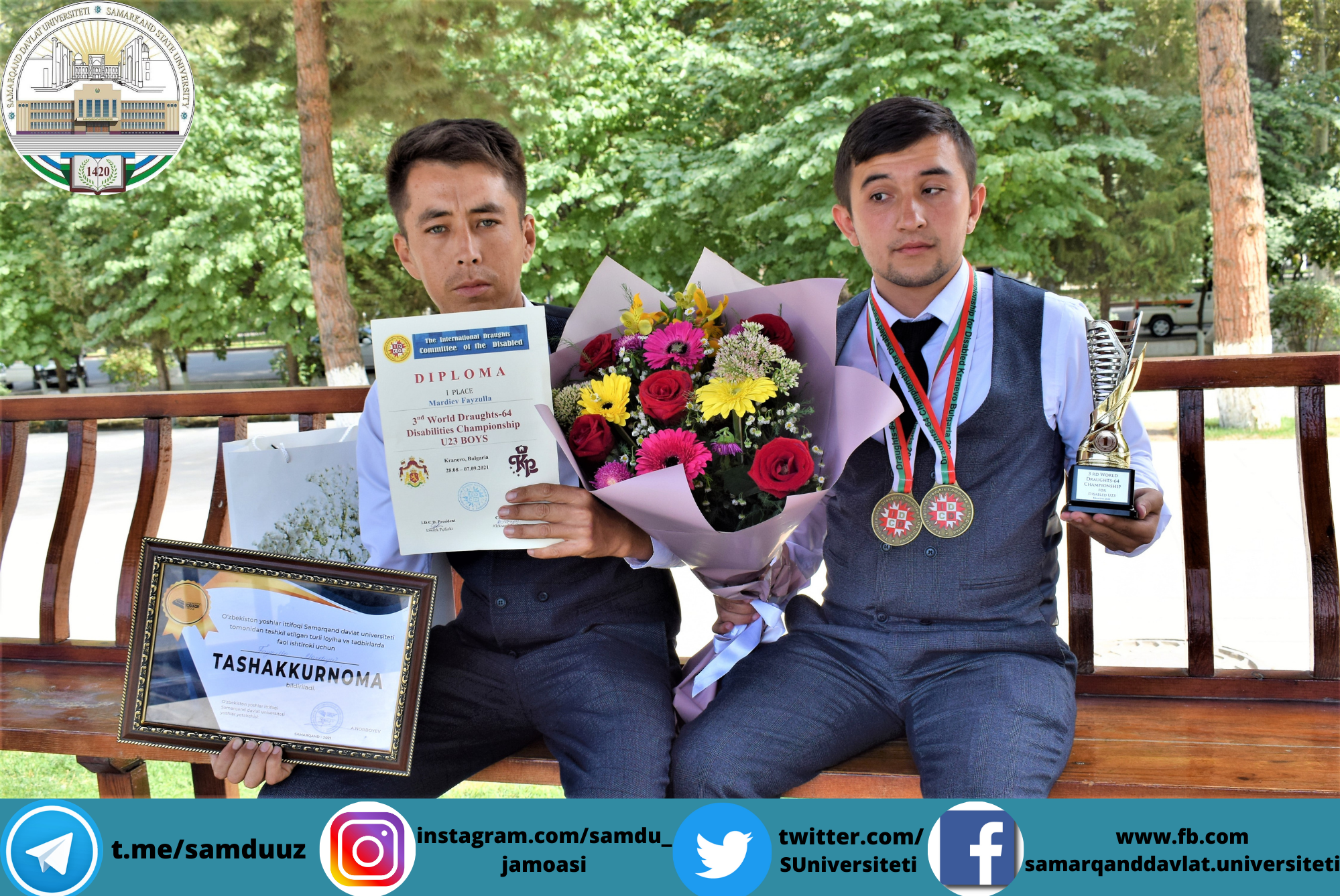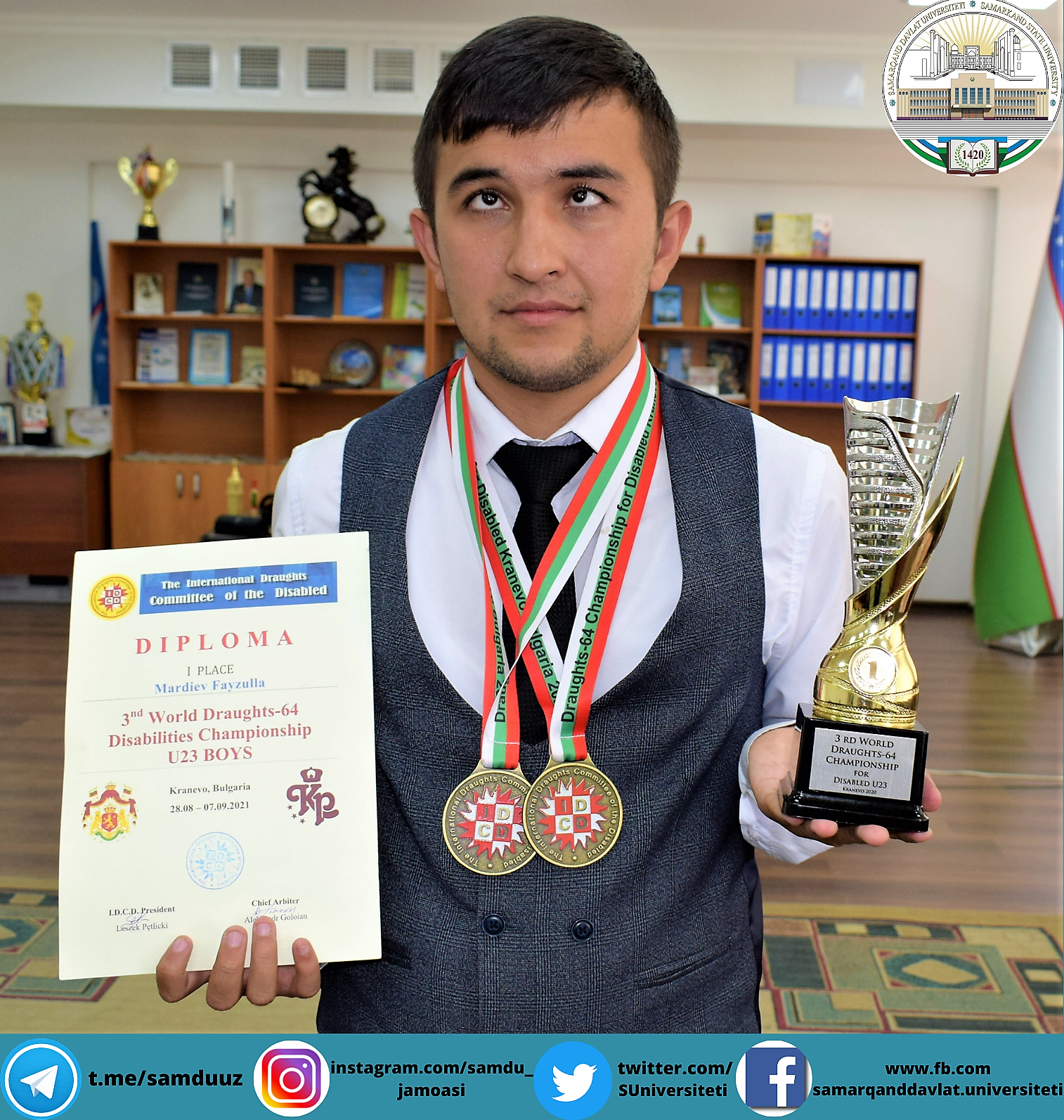Universitetimizning matematika fakulteti 2-bosqich talabasi Fayzullo Mardiyev Bolgariya davlatida para-sportchilar o'rtasida o'tkazilgan jahon chempionatida vatanimiz sha'nini munosib himoya qilib faxrli birinchi o'rinni qo'lga kiritdi.
