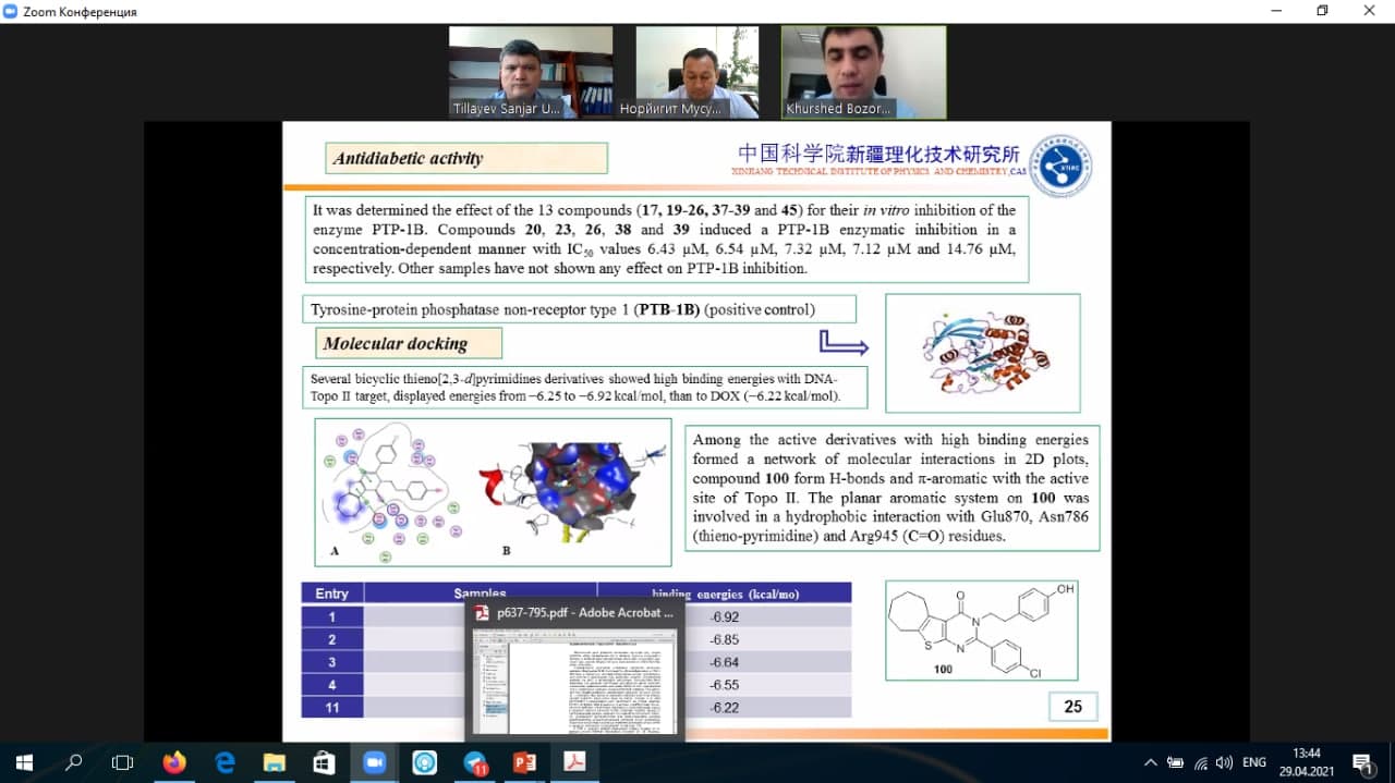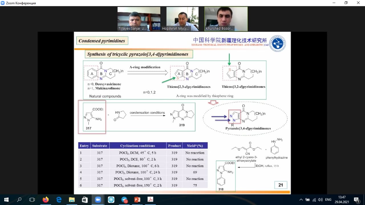 2021 yilning 29 aprel kuni hozirgi kunda Xitoy Fanlar Akademiyasi Fizika va Kimyo texnik instituti xodimi, Samarqand davlat universiteti Organik sintez va bioorganik kimyo kafedrasida o‘rindoshlik asosida mehnat qilayotgan olim, kimyo fanlari doktori Bozorov Xurshid Abdulloyevich onlayn ma’ruza qildi.