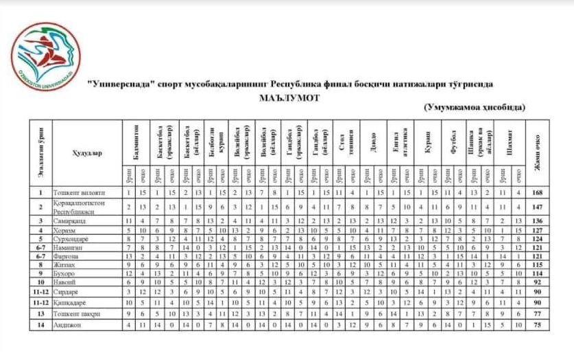 O’zbekiston Respublikasi Vazirlar Mahkamasining 2018 yil 25 oktyabr «O’quvchi va talabayoshlar o’rtasida o’tkaziladigan Respublika sport musobaqalarini yanada takomillashtirish to’g’risida»gi 864-son qaroriga asosan talabayoshlar o’rtasida yangicha formatda o’tkazilgan «Universiada» sport musobaqalari o’z nihoyasiga yetdi. E’tiborlisi shundaki, yangi formatda o’tkazilgan «Universiada» sport musobaqalari Respublikamizning barcha hududlarida sport turlari bo’yicha navbatma-navbat tashkil etildi va o’tkazildi. Mazkur sport musobaqalarida umumjamoa hisobida quyidagi viloyat terma jamoalari g’olib va sovrindor bo’ldilar: 1-o’rin: Toshkent viloyati – 168 ball 2-o’rin: Qoraqalpog’iston Respublikasi – 147 ball 3-o’rin: Samarqand viloyati – 136 ball. Samarqand davlat universiteti talabalaridan tashkil topgan Samarqand viloyati terma jamoasi faxrli 3-o’rinni qo’lga kiritganliklari bilan universitet jamoasi chin yurakdan muborakbod etib, sportchilarimizga keyingi sport musobaqalarida ham yuqori natijalarga erishishlarida omadlar tilaydi.