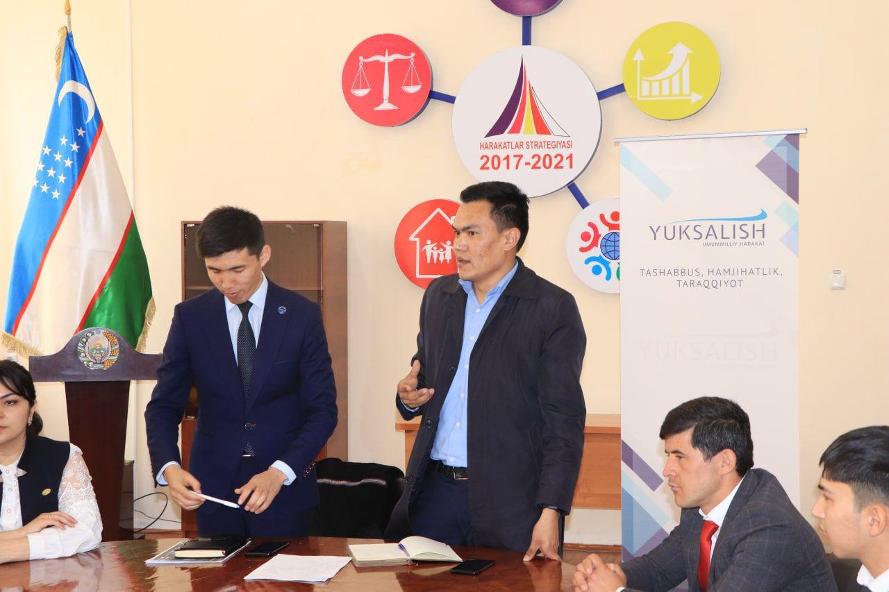 Joriy yilning 19 - yanvar kuni “Yuksalish” umummilliy harakati Samarqand viloyat bo‘linmasi tomonidan O‘zbekiston yoshlar ittifoqi Samarqand davlat universiteti boshlang‘ich tashkiloti Kengashi a’zolari bilan davra suhbati tashkil etildi. SamDUning eng faol va tashabbuskor yoshlari bilan o‘tkazilgan davra suhbatida Prezidentimizning Parlamentga Murojaatnomasida belgilab berilgan ustuvor vazifalar, jumladan, yoshlar siyosatini amalga oshirishga oid asosiy masalalar bo‘yicha so‘z bordi.