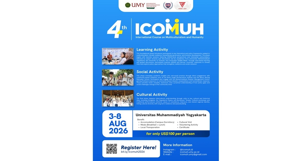 Yogyakarta Muhammadiya universiteti (UMY) butun dunyo oliy ta’lim talabalarini (bakalavriat) intensiv fanlararo dasturda ishtirok etishga taklif etadi. Bu yilgi ICOMUH zamonamizning eng dolzarb muammolaridan biri – Osiyo-Tinch okeani mintaqasida iqlim barqarorligiga bag‘ishlanadi.