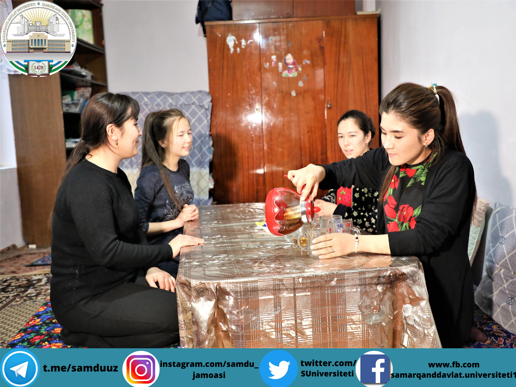Geografiya va ekologiya fakulteti talabalari Go‘zal Olimboeva, Mohiniso Murodullaeva, Nozima Mamatovalar Go‘ri Amir mahallasi, M.Umarov ko‘chasida istiqomat qiladi. Talabalarning yashash sharoitlari o‘rganilib, qish mavsumida is gazi va isitish moslamalaridan foydalanishda ehtiyotkorlik yuzasidan kerakli maslahatlar berildi.