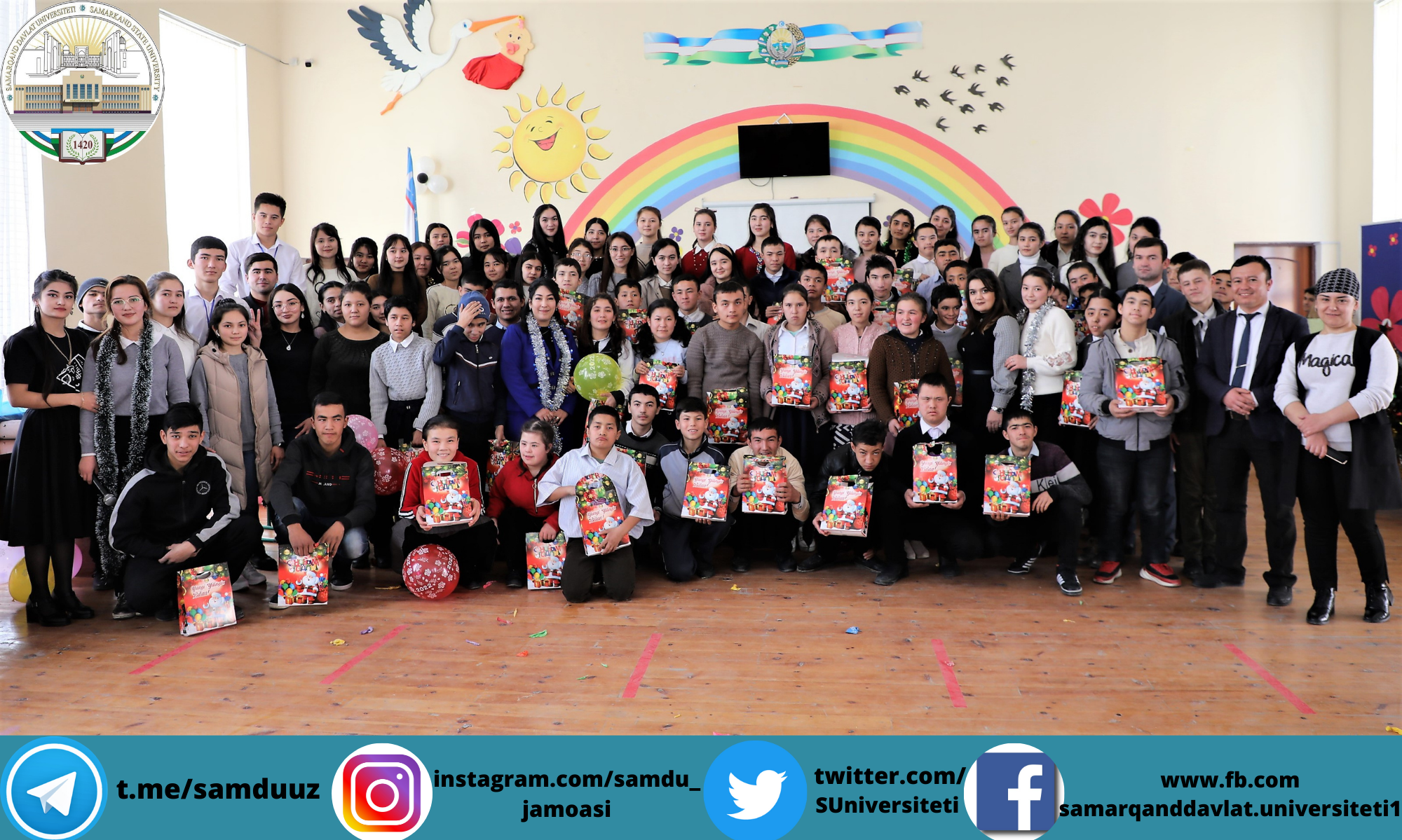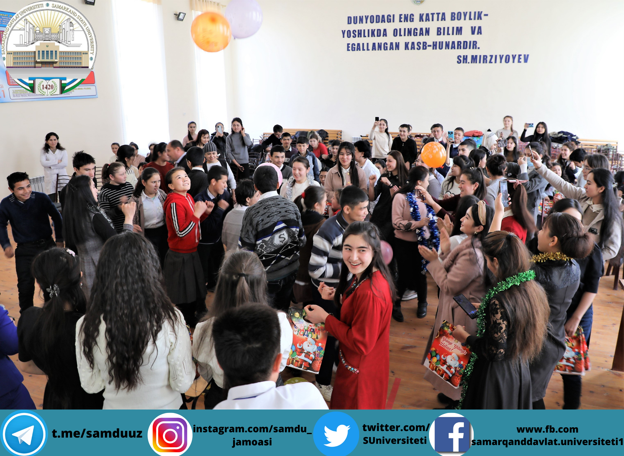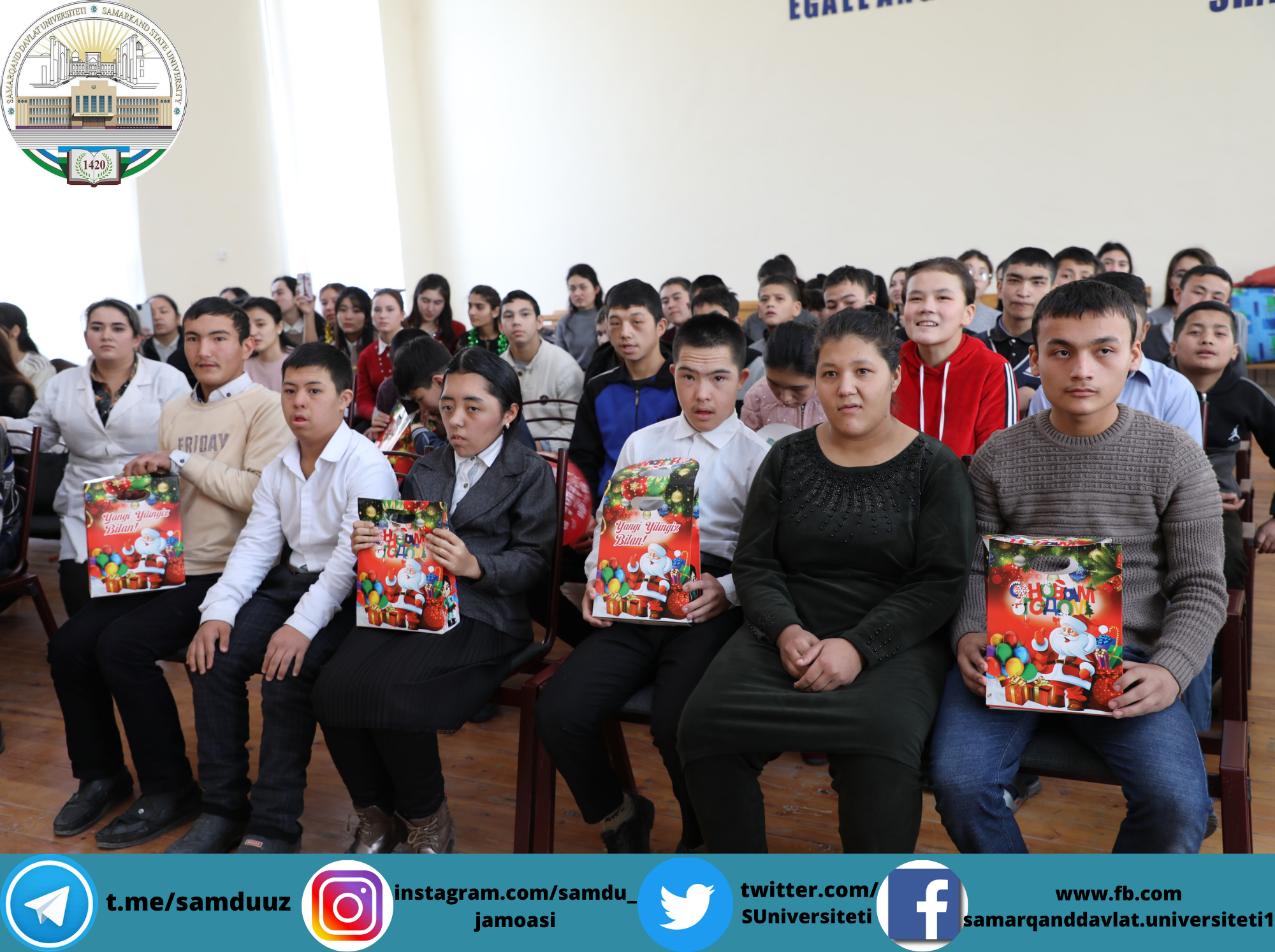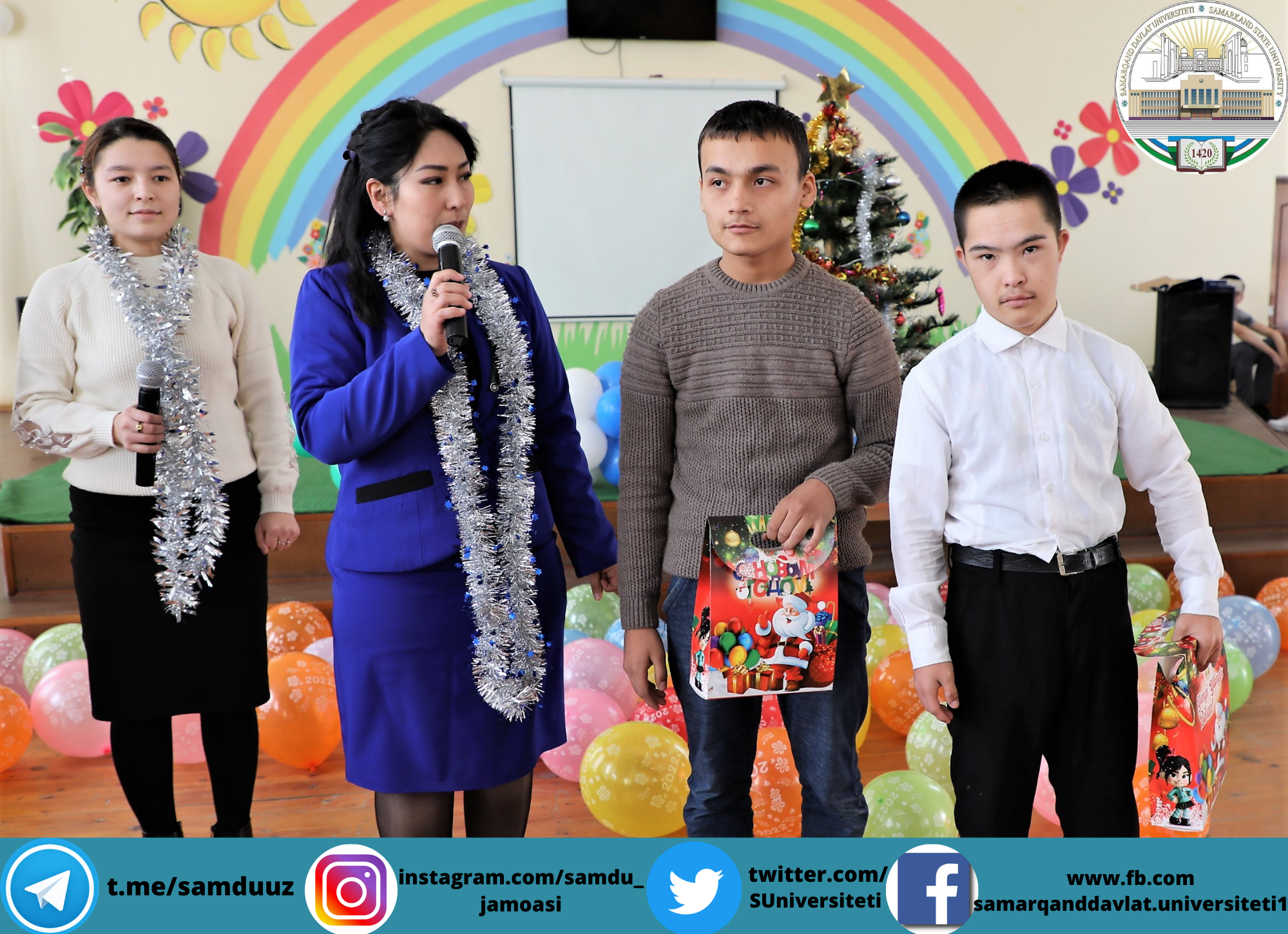Samarqand davlat universiteti filologiya fakulteti jamoasi viloyat Xalq ta’limi boshqarmasi tasarrufidagi 62-sonli imkoniyati cheklangan bolalar maktab-internatiga tashrif buyurdi. Bundan asosiy maqsad o’quvchi-yoshlarga Yangi yil bayram kayfiyatini ulashish. Tadbir ko’tarinki ruhda bo’lib, bolalar uchun qiziqarli o’yinlar, sahna ko’rinishlari namoyish etildi. Shuningdek bayram sovg’alari topshirildi.