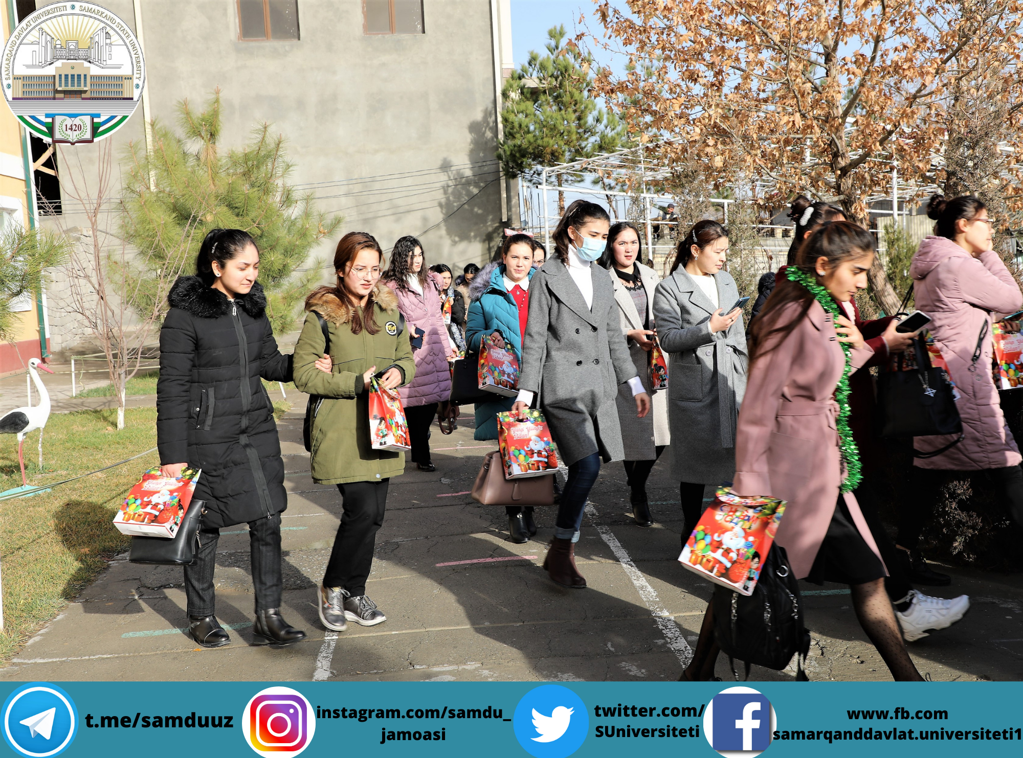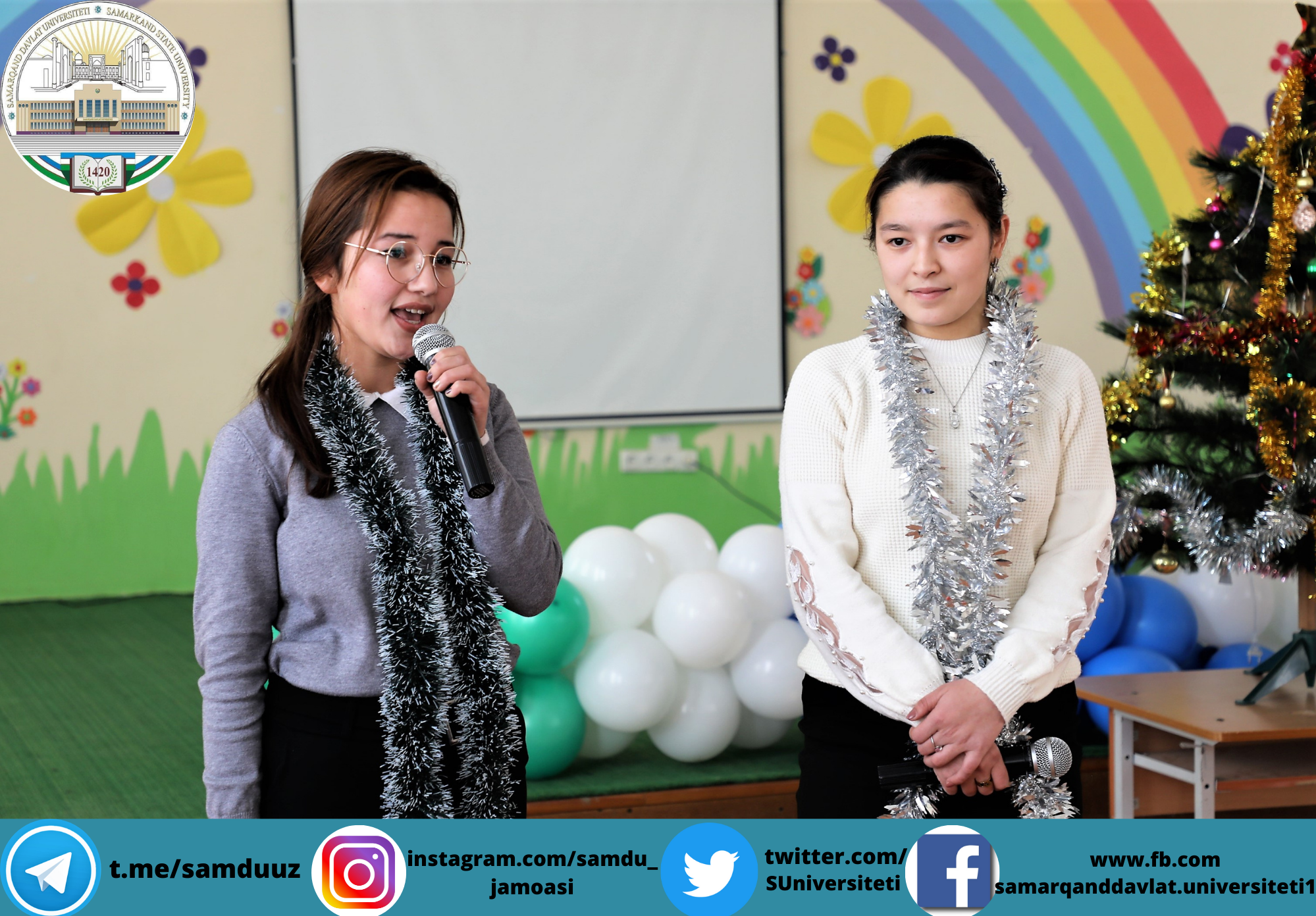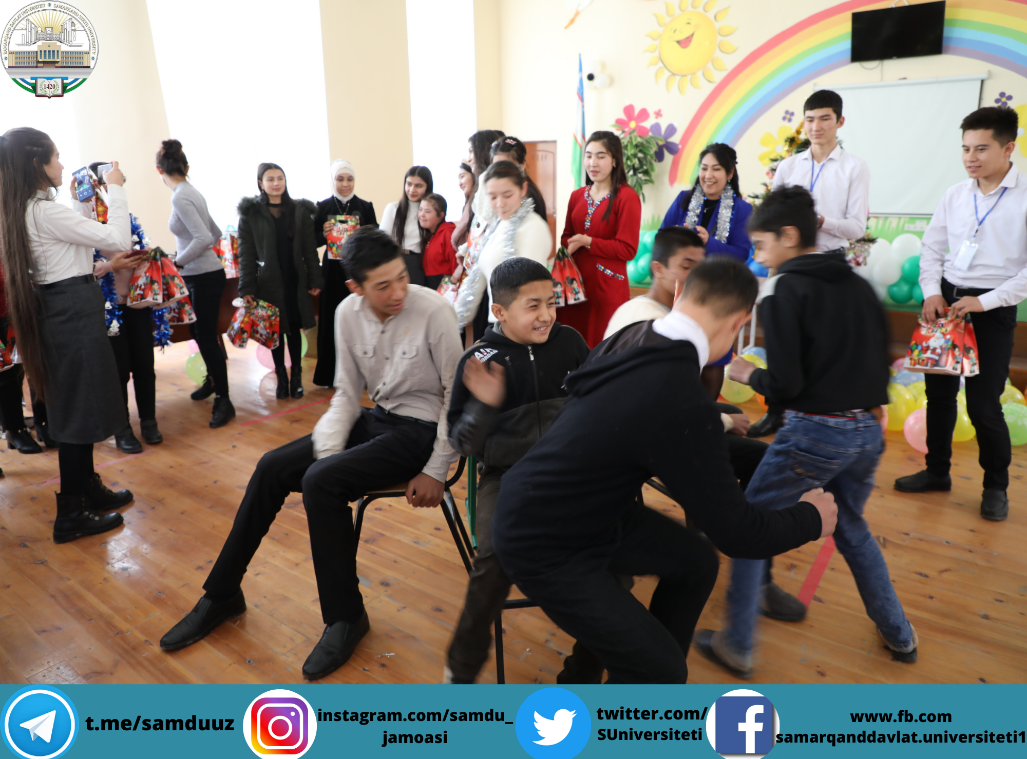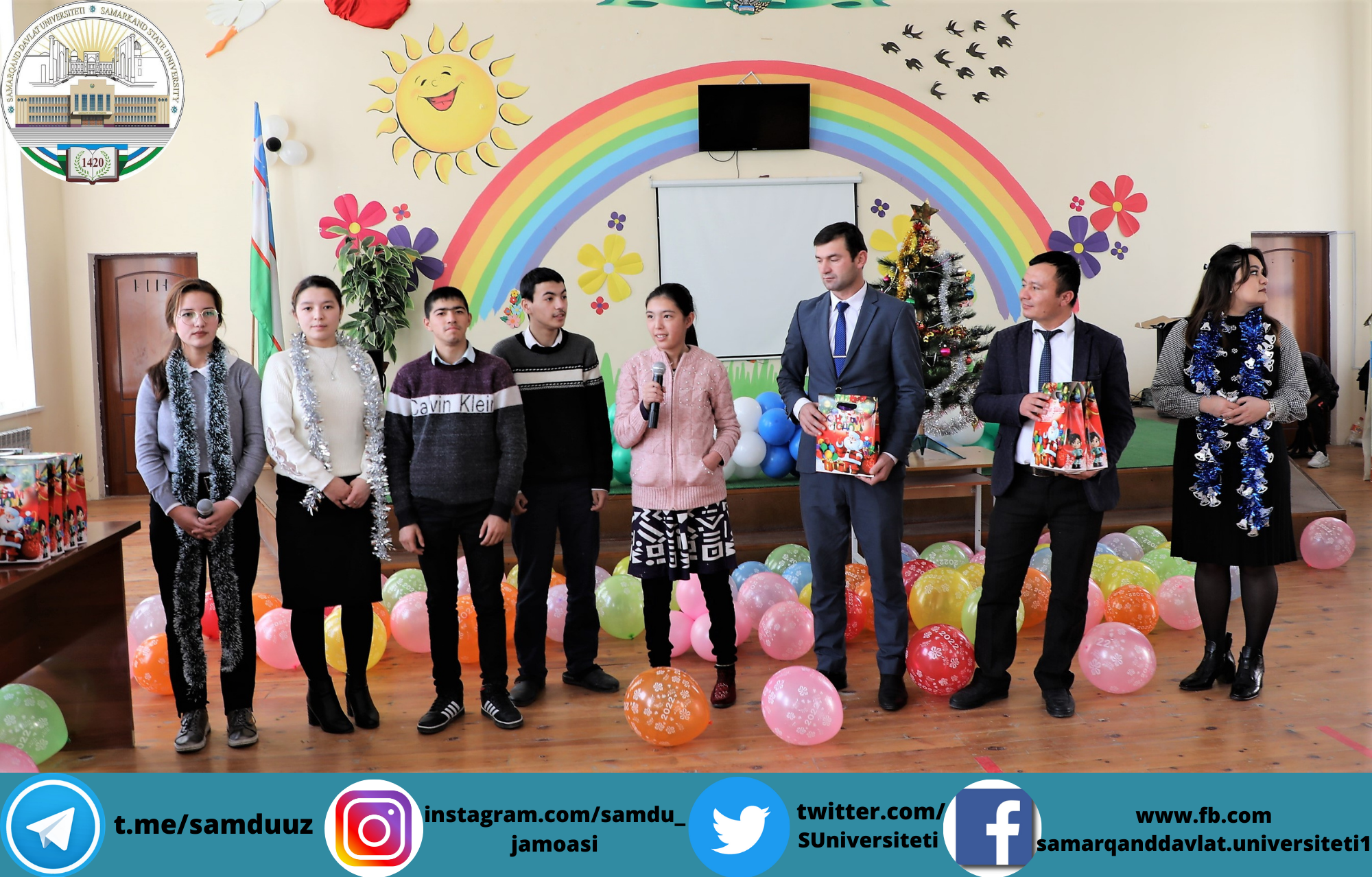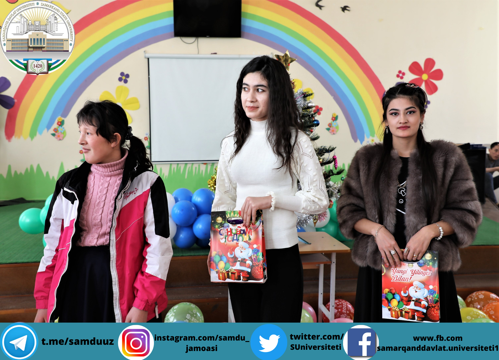Samarqand davlat universiteti filologiya fakulteti jamoasi viloyat Xalq ta’limi boshqarmasi tasarrufidagi 62-sonli imkoniyati cheklangan bolalar maktab-internatiga tashrif buyurdi. Bundan asosiy maqsad o’quvchi-yoshlarga Yangi yil bayram kayfiyatini ulashish. Tadbir ko’tarinki ruhda bo’lib, bolalar uchun qiziqarli o’yinlar, sahna ko’rinishlari namoyish etildi. Shuningdek bayram sovg’alari topshirildi.