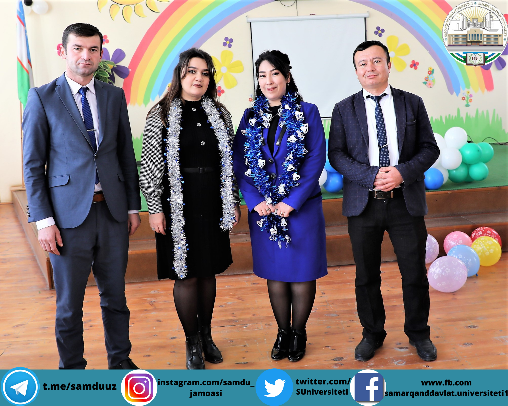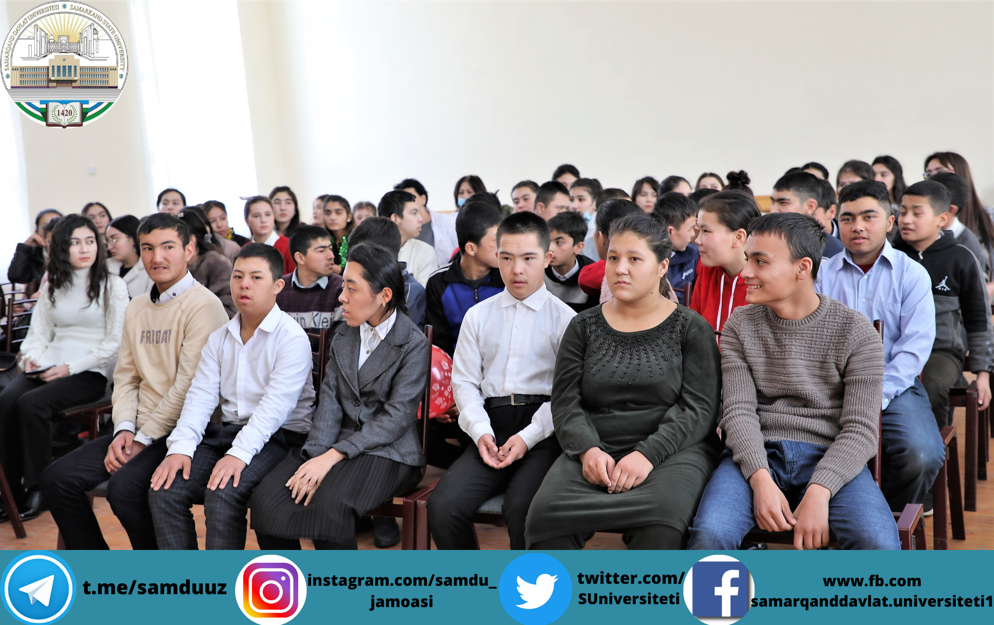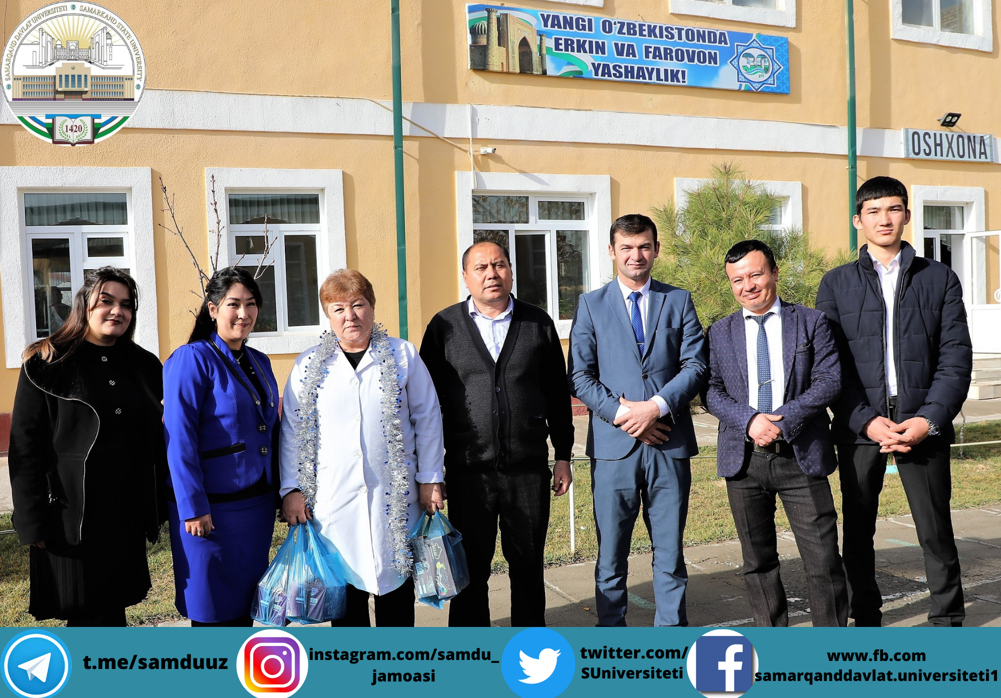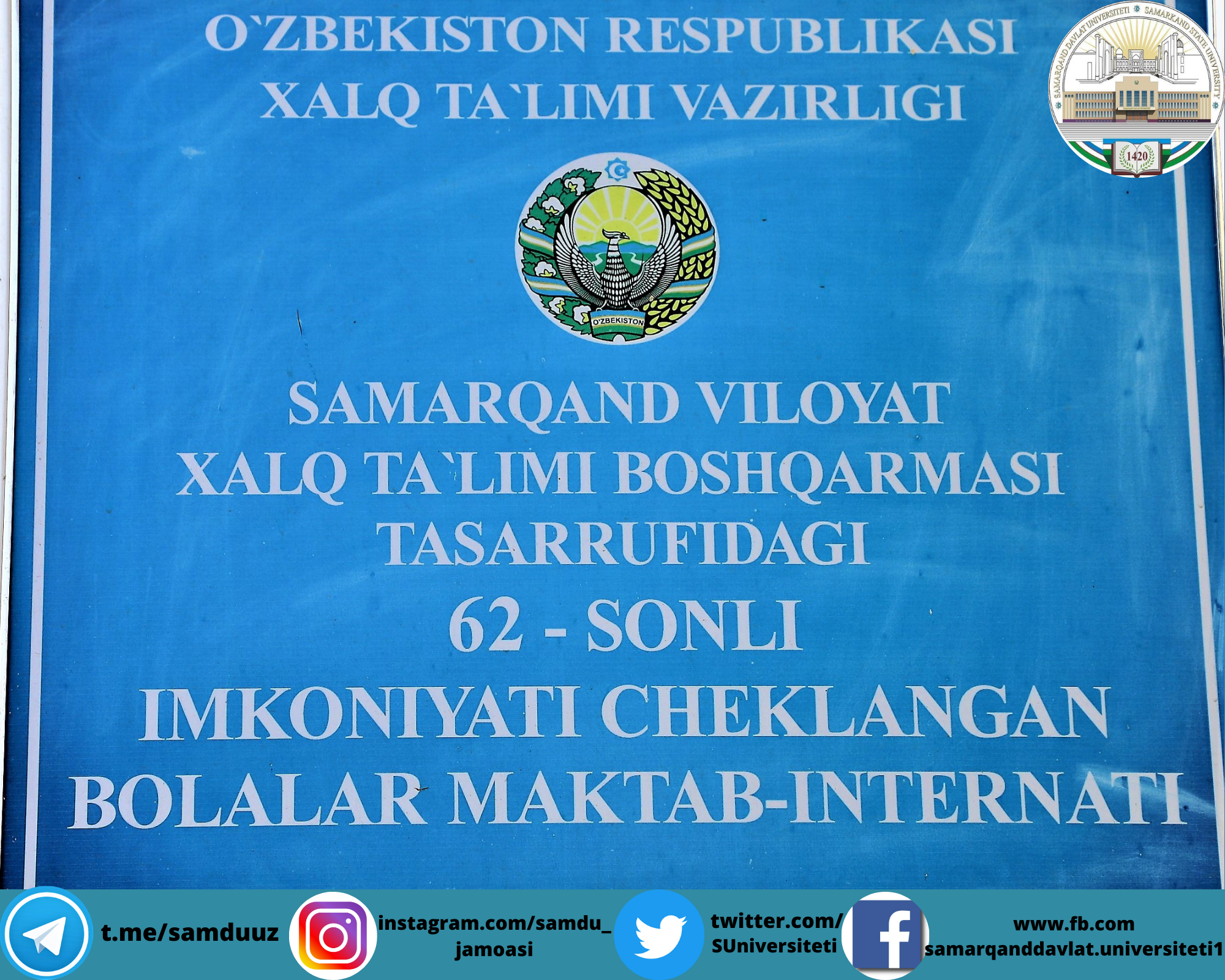 Samarqand davlat universiteti filologiya fakulteti jamoasi viloyat Xalq ta’limi boshqarmasi tasarrufidagi 62-sonli imkoniyati cheklangan bolalar maktab-internatiga tashrif buyurdi. Bundan asosiy maqsad o’quvchi-yoshlarga Yangi yil bayram kayfiyatini ulashish. Tadbir ko’tarinki ruhda bo’lib, bolalar uchun qiziqarli o’yinlar, sahna ko’rinishlari namoyish etildi. Shuningdek bayram sovg’alari topshirildi.