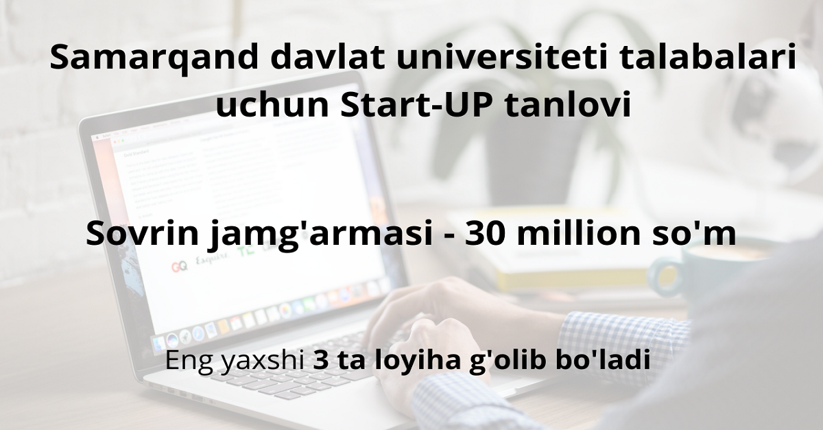 Samarqand davlat universiteti talabalari uchun sovrin jamg‘armasi 30 million so‘m bo‘lgan “Yangi istiqbolli yoʻnalishlar boʻyicha Start-UP loyihalar tanlovi”ni eʼlon qiladi