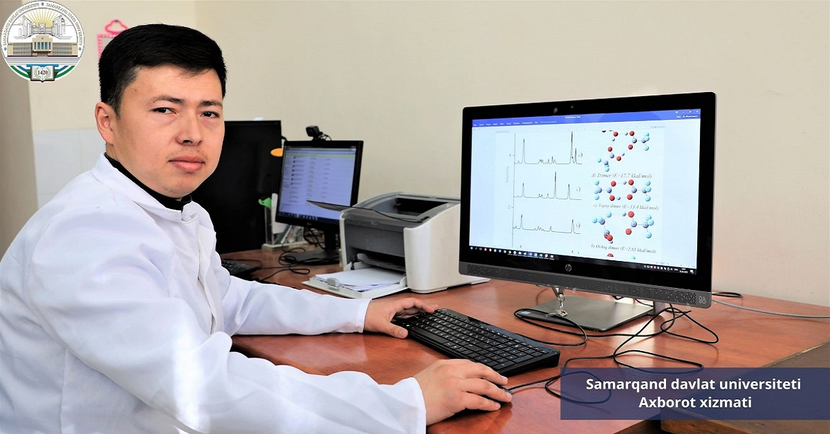 Samarqand davlat universiteti optika kafedrasi doktoranti O‘tkirjon Xoliqulov “Vodorod bog‘lanishli molekulyar komplekslarning kombinatsion sochilish spektrlari” mavzusida ilmiy izlanish olib bormoqda.