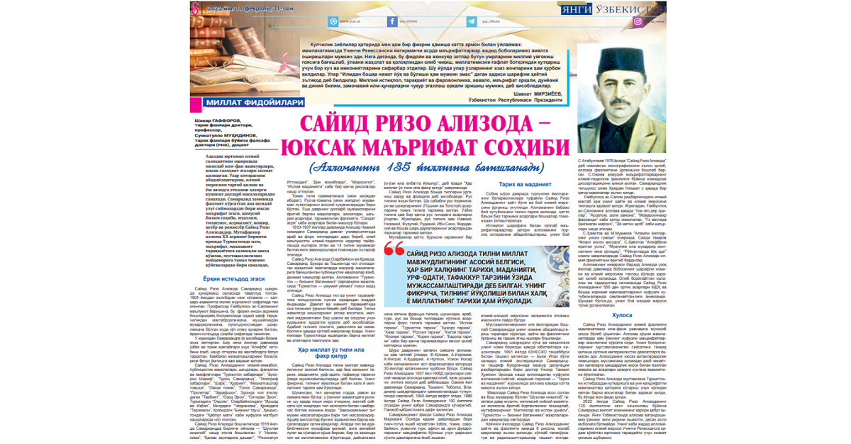 Samarqand davlat universiteti professori Shokir Gʻafforov va universitet dotsenti Sunnatillo Muhiddinovning hammualliflikdagi "Sayid Rizo Alizoda - yuksak ma’rifat sohibi" nomli maqolasini "Yangi O‘zbekiston" gazetasining 2022-yil 11-fevral (№ 31) sonida o‘qing.