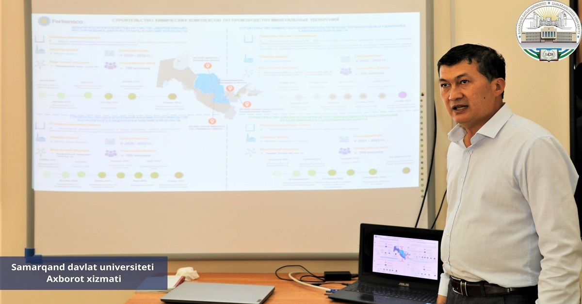 Sharof Rashidov nomidagi Samarqand davlat universiteti kimyo fakultetida “Ferkensco” kimyo zavodi bosh muhandisi Ravshan Isoqulov ishtirokida bitiruvchi kurs talabalari uchun seminar trening tashkil etildi. Davra suhbatidan ko’zlangan asosiy maqsad talabalar bandligini ta’minlash va ularga bo’sh ish o’rinlari taklif etishga qaratilgan. Ravshan Isoqulov Samarqand shahrining Kimyogarlar shaharchasida yangi qurilayotgan kimyo zavodining tarkibiy tuzilmalari bilan talabalarni tanishtirib o‘tar ekan, zavodning asosiy tarmoqlari va bajaradigan vazifalari masalalariga alohida to‘xtaldi: