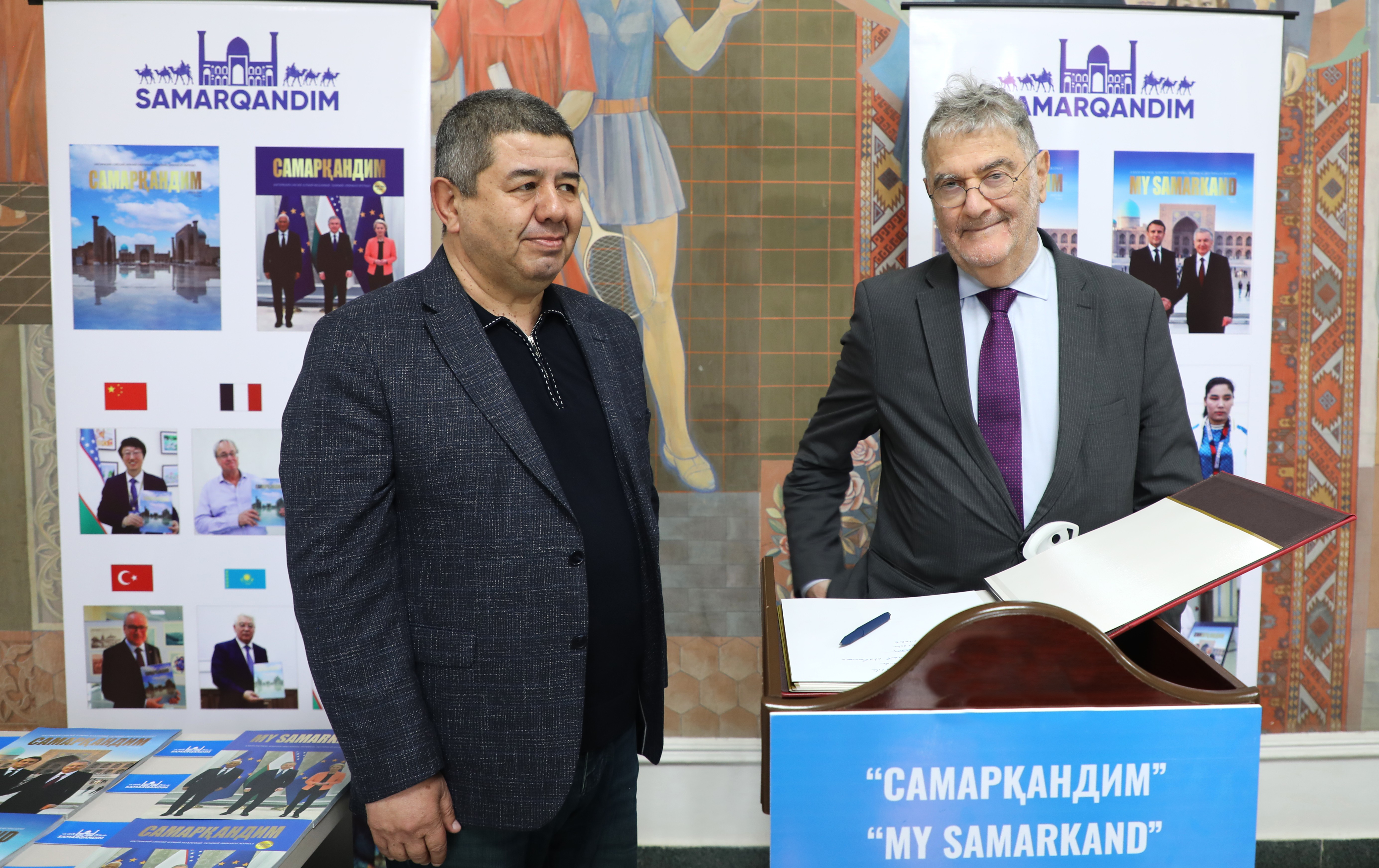 Anjuman boshlanishidan avval mehmon "Samarqandim" – "My Samarkand" jurnalining “Faxriy mehmonlar kitobi”ga o‘zining dil tilaklarini yozib qoldirdi.