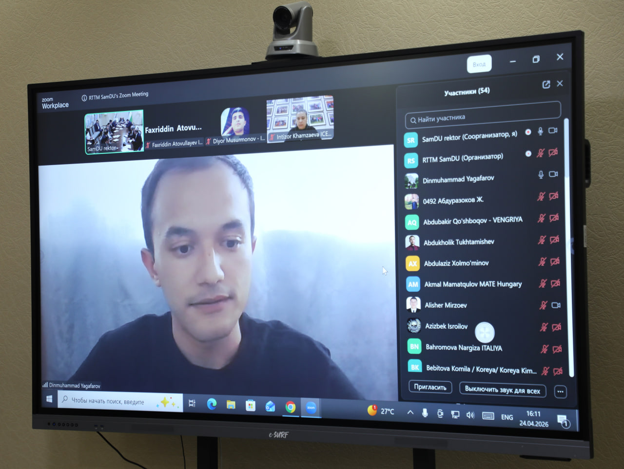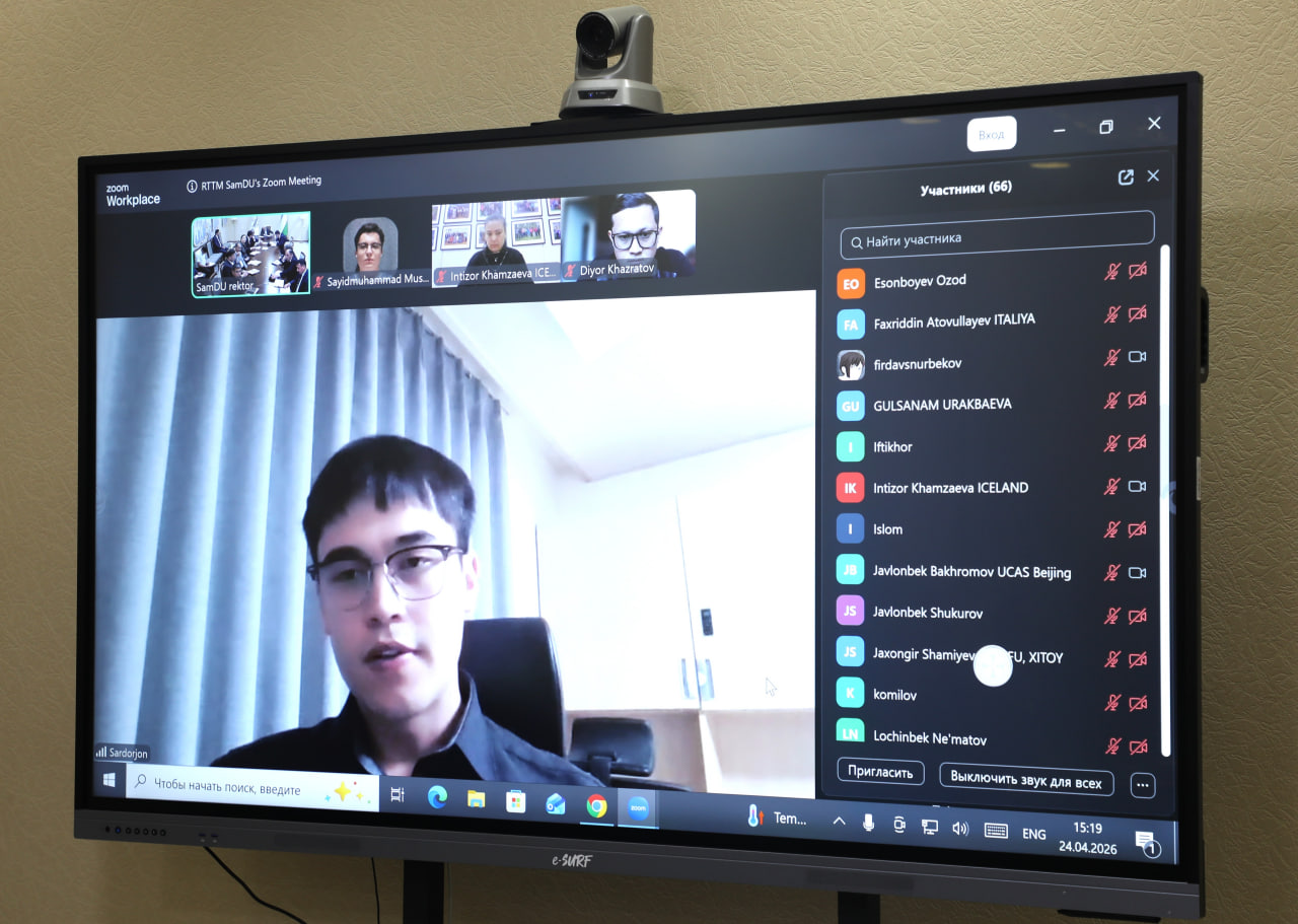 SamDU rektori Rustam Xolmurodov xorijda tahsil olayotgan magistrantlarning keyingi rejalari bilan qiziqdi. Onlayn muloqotda qatnashgan magistrantlar o‘zlari tanlagan yo‘nalishlar, ilmiy qiziqishlari hamda kelgusidagi tadqiqot rejalari haqida ma’lumot berib, o‘z fikr-mulohazalarini bildirdilar.